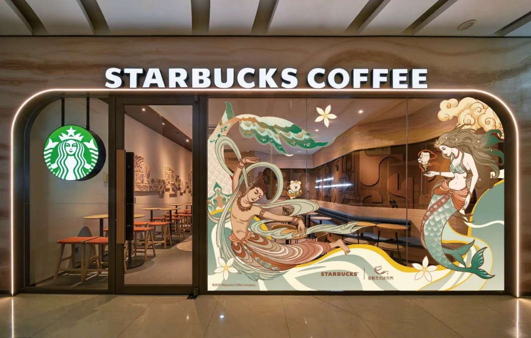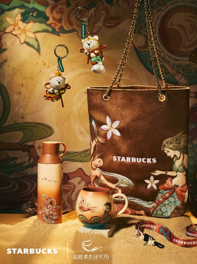 9月23日起,星巴克敦煌首店——益旺国际店将化身敦煌主题店。敦煌的灿烂美景与咖啡香在此融合,与千年文明共舞。现代风格的飞天形象,与身着飞天彩锦的塞壬相会,二者手执咖啡树披星而来,在鱼尾与云纹的簇拥下,于一座如咖啡宇宙般的时空中相遇。皓月当空、彩云呈祥,寓意着传统文化与现代生活的交融碰撞与和谐共生,呈现出一派华美古朴、又充满艺术张力的独特第三空间。与此同时,全国100余家主题陈列店也将一展敦煌风姿。