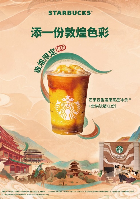 此外,敦煌主题店也将在十一期间限时推出敦煌限定客制化饮品,为假期增添一份敦煌色彩——在芒果西番莲果茶星冰乐中,注入的金烘浓缩咖啡缓缓流下,就像鸣沙山的沙坡,呼应了大漠黄昏的浓郁色调。从视觉上感受“入梦敦煌”,将文化共鸣延伸至味蕾,将敦煌的灿烂美景与咖啡香在此融合,与千年文明共舞,让人一杯入梦敦煌。