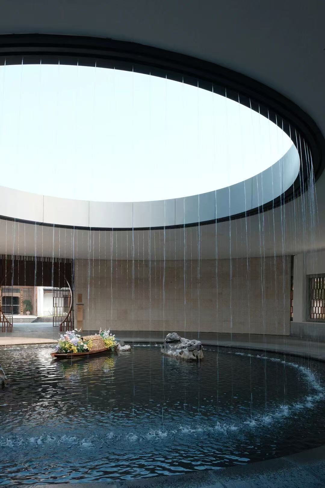 酒店的落客区设计成圆形空间,彰显"天圆地方"之感。中央水景上方是圆形的天井,规整的圆形象征着和谐与统一,表达着中式宇宙观,迎接宾客走进这座静谧的宅邸。