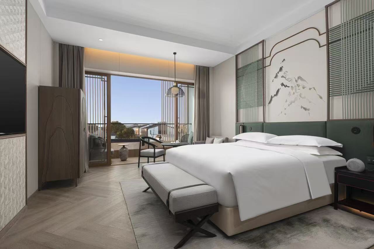 127间木石居客房是酒店的主力房型,每间都配有私人阳台,推开窗便是江南园林的景致。温润的木质元素,淡雅的米灰色调,呼应诗中"空山"的静谧。