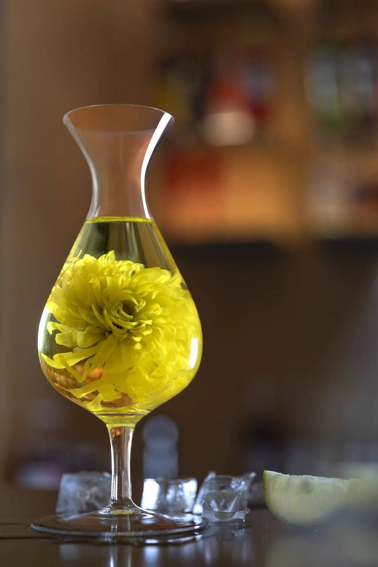 “黄花醉”取意华察诗句“餐菊”,诗人与友人赏菊,以鲜金丝皇菊融合苹果汁与伏特加,加入牛奶调和口感,澄清工艺令酒体通透清亮,饮之甘润清爽。