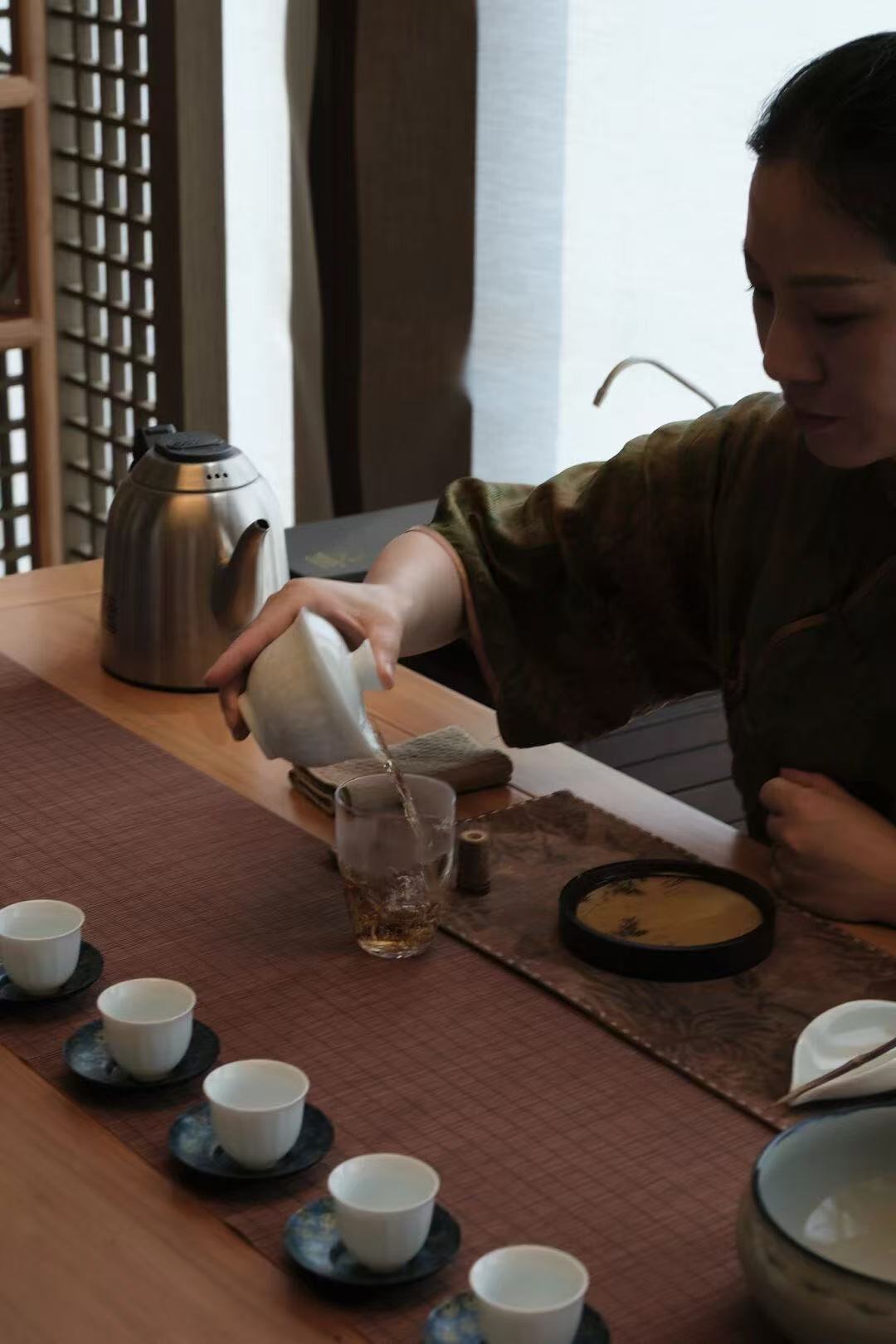 空气中弥散木香,不同区域设有定制香氛与背景音乐。这里,历史与文化在每个细节中得以传承,迎接每一位宾客走进这座文化深厚的时光府邸。茶道品鉴时,茶艺师素衣执壶,温杯、洗茶、冲泡,一气呵成。
