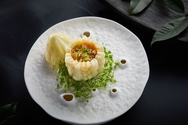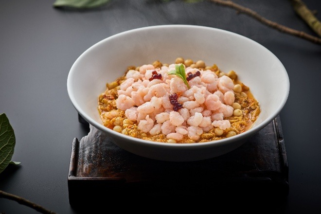 指橙海胆文思豆腐蟹肉冻:菜品灵感源自淮扬名菜“文思豆腐”。嫩豆腐细切如丝,佐以蟹肉,鲜甜交融。海胆与指橙点缀其上,鲜美柔滑和丰腴酸爽的口感巧妙平衡,打造出一道融合传统风雅与江南韵味创新表达的时鲜美馔。