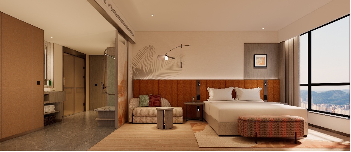 酒店拥有140间现代舒适客房,均位于28层及以上高空,其中包括家庭房及连通客房满足不同宾客的出行需求。透过客房的大面积落地窗,宾客可以尽享奔腾不息的黄河胜景或壮丽的城市景观。步入客房,客房专属“绽欣版”的细节设计,为宾客提供高性价比的住宿体验:客房配备国际知名品牌自动升降桌椅、高性能护眼灯、符合人体工学的办公椅, 打造灵动智能办公体验;3D打印的墙纸、转角沙发、花瓣造型的壁灯打造轻松惬意的婆娑沙发角落;智能卫浴等现代化设施,兼顾舒适与效率。