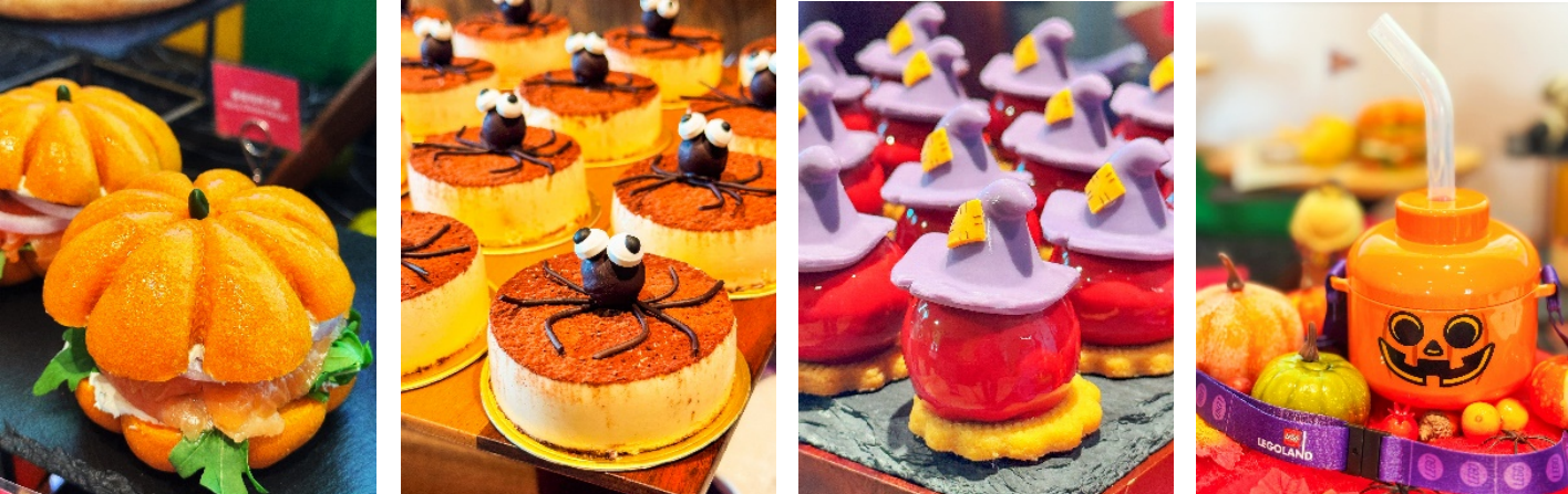 主题活动期间,乐园的主题餐饮也全面“变装”,多种特色美味已经就位,等你来打卡品尝。在积木大街咖啡厅,不给积木就捣蛋甜甜圈以及乐高乐园®DIY角色饼干限时上新,饥饿大嘴龙厨的汉堡变身南瓜造型,让美食也充满节日的氛围。城市餐厅为游客准备了小幽灵披萨,积木街道咖啡馆则呈现各式蜘蛛和蜘蛛网造型的甜点,把舌尖上的搞怪氛围拉满。骑士餐厅不仅准备了主题家庭套餐,还有小怪兽盛宴派对主题自助晚餐会在10月25-26日、31号以及11月1-2日限时供应,玩了一整天的大小游客们可以一起大快朵颐,给疲惫的肠胃“充个电”。另外,各个主题区还有多款限定特饮惊喜上线,更有南瓜头角色纪念杯等你带回家。