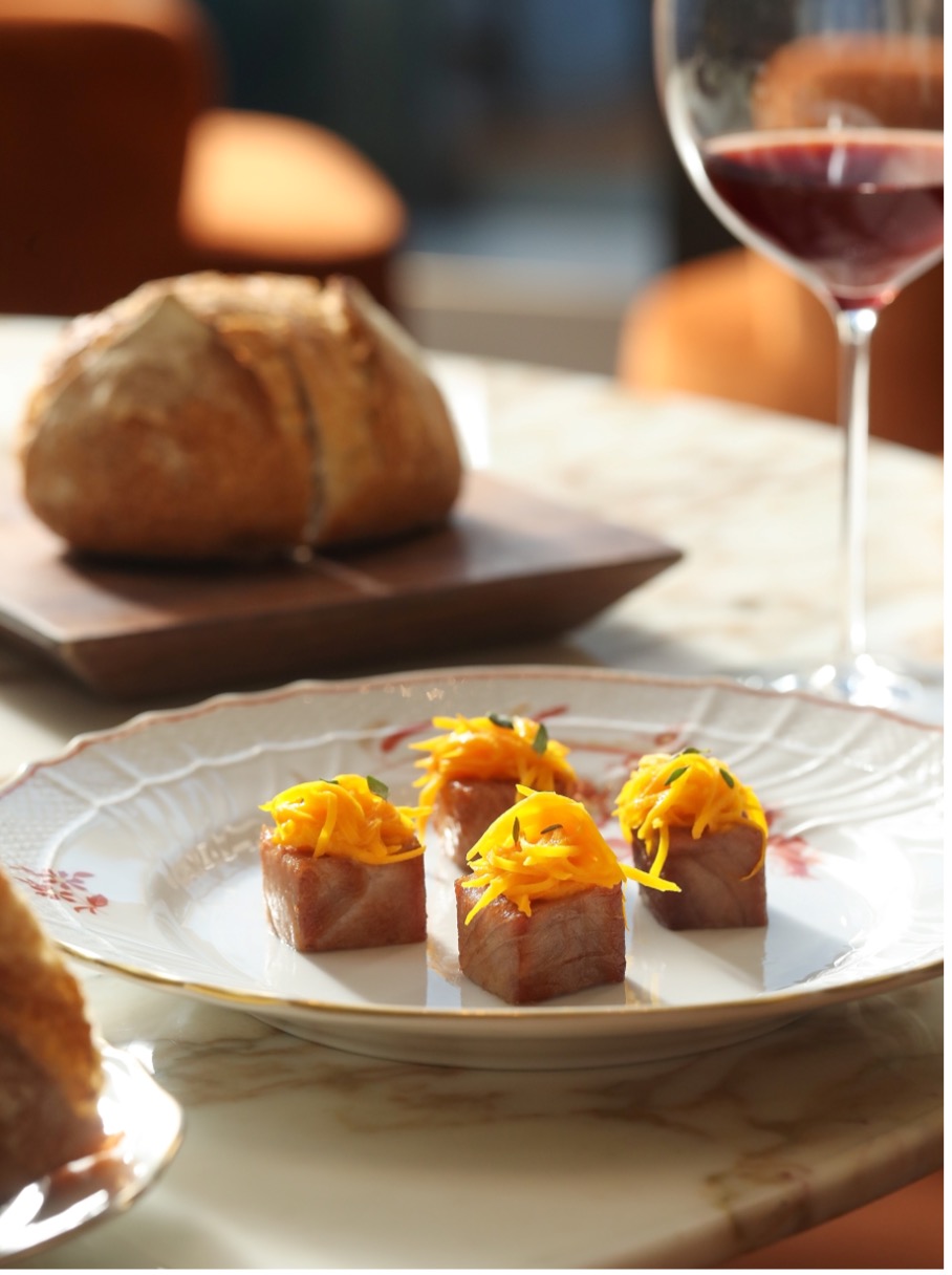 釉面黄鱼配土豆及欧芹,黄鱼外皮煎至釉色莹亮,内里肉质细嫩如蒜瓣。搭配绵密香滑的土豆泥与清新欧芹酱,口感层次分明,雅致中融合海洋的鲜润与陆地的清香。备受喜爱的意式手工饺子配红虾,黄油,柠檬及沙葱,传统意式饺子包裹细腻鲜甜红虾,馅料饱满而轻盈。以澄黄油汁轻裹,缀以现刨柠檬皮与清脆沙葱,入口丰润不腻,柠檬微酸巧妙提鲜,诠释秋日丰收的细腻与温暖;烤金枪鱼腩配南瓜及香橙,则选用优质金枪鱼腩,经精准火候烤制,外层微焦酥香,内里脂润柔嫩。搭配慢烤甘甜南瓜泥与清新香橙酱汁,南瓜的绵密与香橙的明亮果酸交织出饱满风味。