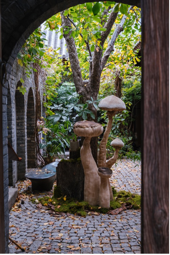 当我们的视野从大千世界的循环,收回到檐下廊前的角落时,共生便从一种自然法则,悄然转化为一种可被感知的生命姿态。小小的菌蕈不显于外,而菌丝网络却在地下悄然蔓延,连接万物。它不遵循建筑的线性逻辑,不衫不履,偶然闯入规整的四合院,以自在的形态解构古典空间。它不喧哗,却以静默的姿态在庭院角落言说。它附于檐下隅落,展现一种天真未凿、摆脱拘束的生命状态,不执着于独存,而在共生中丰盈。