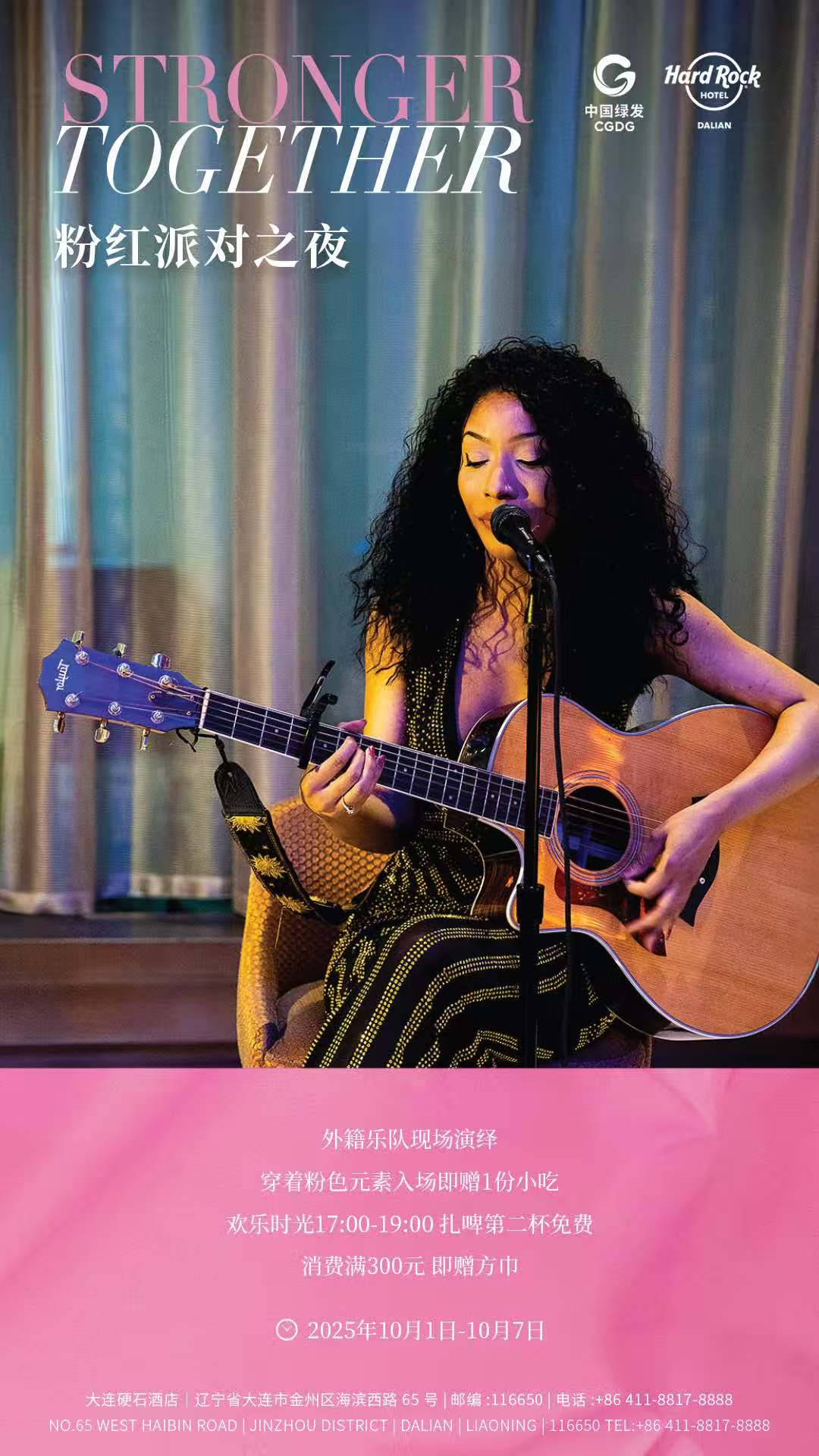 中国区的硬石酒店亦以独具活力的方式,参与着这场爱心接力。大连硬石酒店呈献「粉红派对之夜」,由外籍乐队现场演绎乐曲,以音乐点燃希望。宾客只需佩戴或着装粉色元素入场,即可获赠精美小食;欢乐时光(17:00-19:00)期间,扎啤享“第二杯免费”礼遇,消费满300元还可获赠限量方巾,为乳腺癌防治献出爱心。深圳硬石酒店推出充满惊喜的粉红主题体验,宾客于酒店任意消费即可免费体验粉色美甲,或于合作美甲店尊享特别礼遇,同时酒店也组织内部员工制作粉红主题手链,并宣讲预防乳腺癌的健康知识。此外,酒店特别策划「十月限定音乐之旅」,甄选多张“粉红十月”主题黑胶唱片、限定电吉他与木吉他、并以主题房卡搭配精选播放列表,在旋律与微笑中共襄善举。