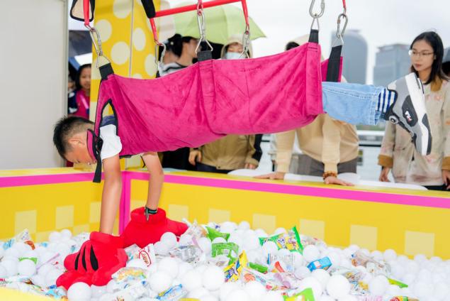 “真人抓娃娃机”是当日全场焦点,只要踊跃参与“乐动挑战营”、“步步为赢”、“诗词大会”及“花花时间”四项互动游戏,完成集章便可免费兑换体验资格。现场,大小朋友们亲身探入“巨型抓娃娃池”抓取零食,此起彼伏的欢笑声中,全是满载而归的喜悦,让互动体验更显鲜活尽兴!