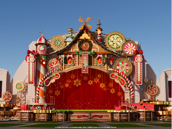 随着冬季假日的大幕缓缓拉开,北京环球度假区带着满满诚意倾力打造又一年度力作“最棒的礼物”。好莱坞剧场的全新奇幻舞台以高耸的风车、糖果风的齿轮、闪烁的灯饰等元素,营造出一个活灵活现的精灵玩具工厂,金色的机械装置与红绿相间的冬日装饰彼此呼应,搭配雪顶木屋、礼物、花条与彩灯,让整个舞台空间散发节日的温馨与期待。
