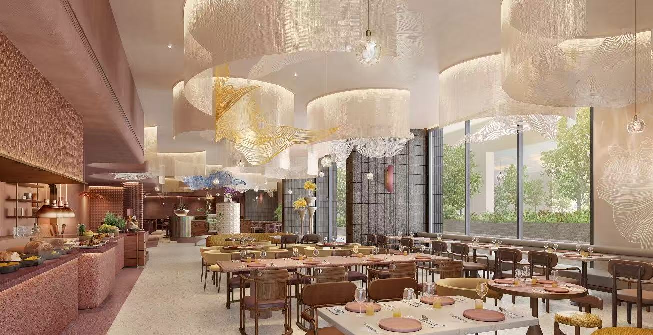 深入探索,你会抵达Vilah社交创意空间——这里是创意工作坊的策源地,也是串联宾客互动的生活方式中心。猫眼石的灵韵被唤醒,头顶发光背板洒下柔和光辉;书籍装帧与纸艺工作室LIKAYBINDERY的纸质艺术装置、Studio JEW+手绘的猫咪插画,为空间注入趣味细节。连电梯也成为体验的一部分,以月光石般乳白色光泽迎接宾客,每次乘坐都化作静思时刻,灯光随月相微妙变幻。