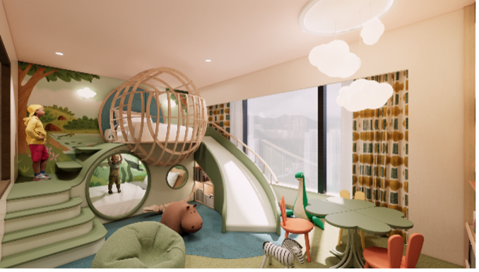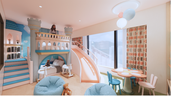 酒店还特别为亲子家庭打造两大主题客房:“船湾童趣客房”以海洋探险为主题,采用温暖大地色系与清新绿色调,营造自然温馨氛围,配备儿童游戏空间,让小朋友仿佛置身欢乐航海旅程;“亲子堡垒客房”则以城堡探险为概念,采用蓝白配色,设有城堡造型游乐设施,为家庭旅客提供安全有趣的亲子互动空间,致力为家庭旅客创造难忘的度假体验。