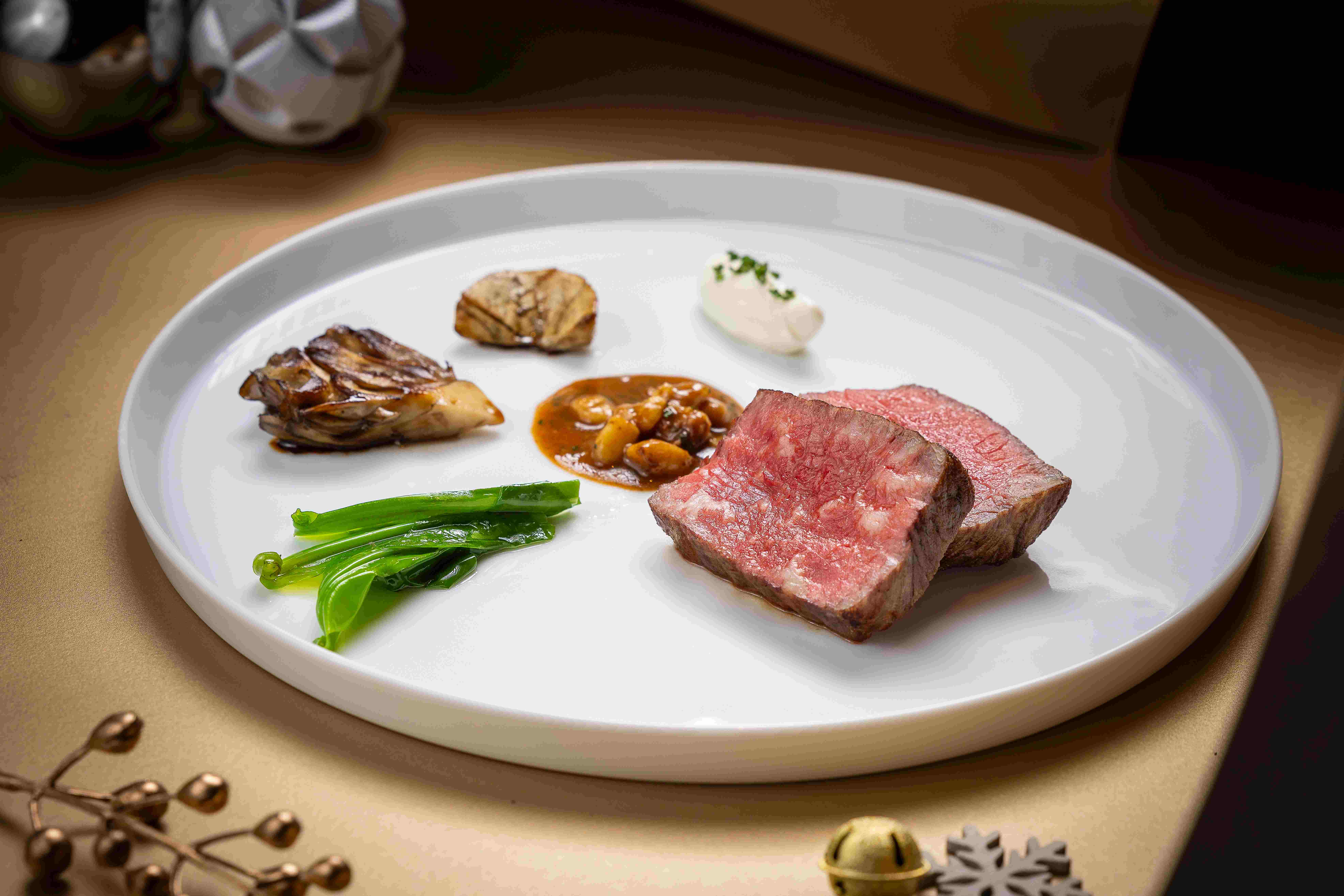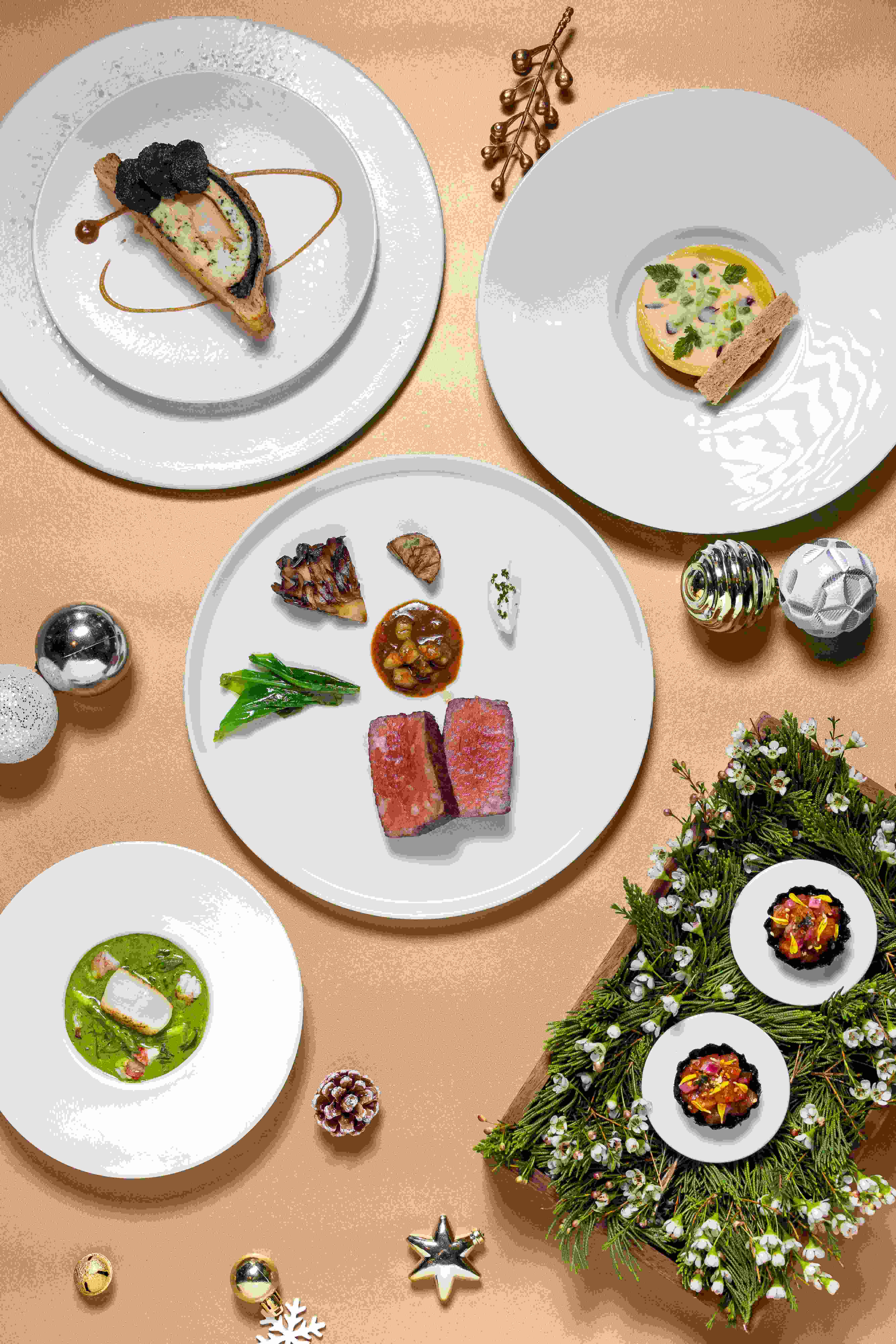 ARAME西餐厅奉隆重呈献十二道式圣诞晚宴,以精湛技艺重新诠释节日珍馐。晚宴以「馥郁碳烤甜豆挞」开启序章,「蓝鳍金枪鱼脆挞」与「鱼子酱甜菜挞」相继登场,唤醒味蕾体验。主厨以现代料理手法演绎传统圣诞风味——「碳烤熟成鱼」展现精准火候,「碳烤大管鱿鱼」尽显海洋本味,手工「海鲜意面」融合地中海风情,「鲍鱼鸡松露」则演绎奢华搭配。压轴登场的「雪球圣诞树」甜品,以匠心造型营造冬日意境,为宾客缔造温暖而难忘的圣诞飨宴记忆。