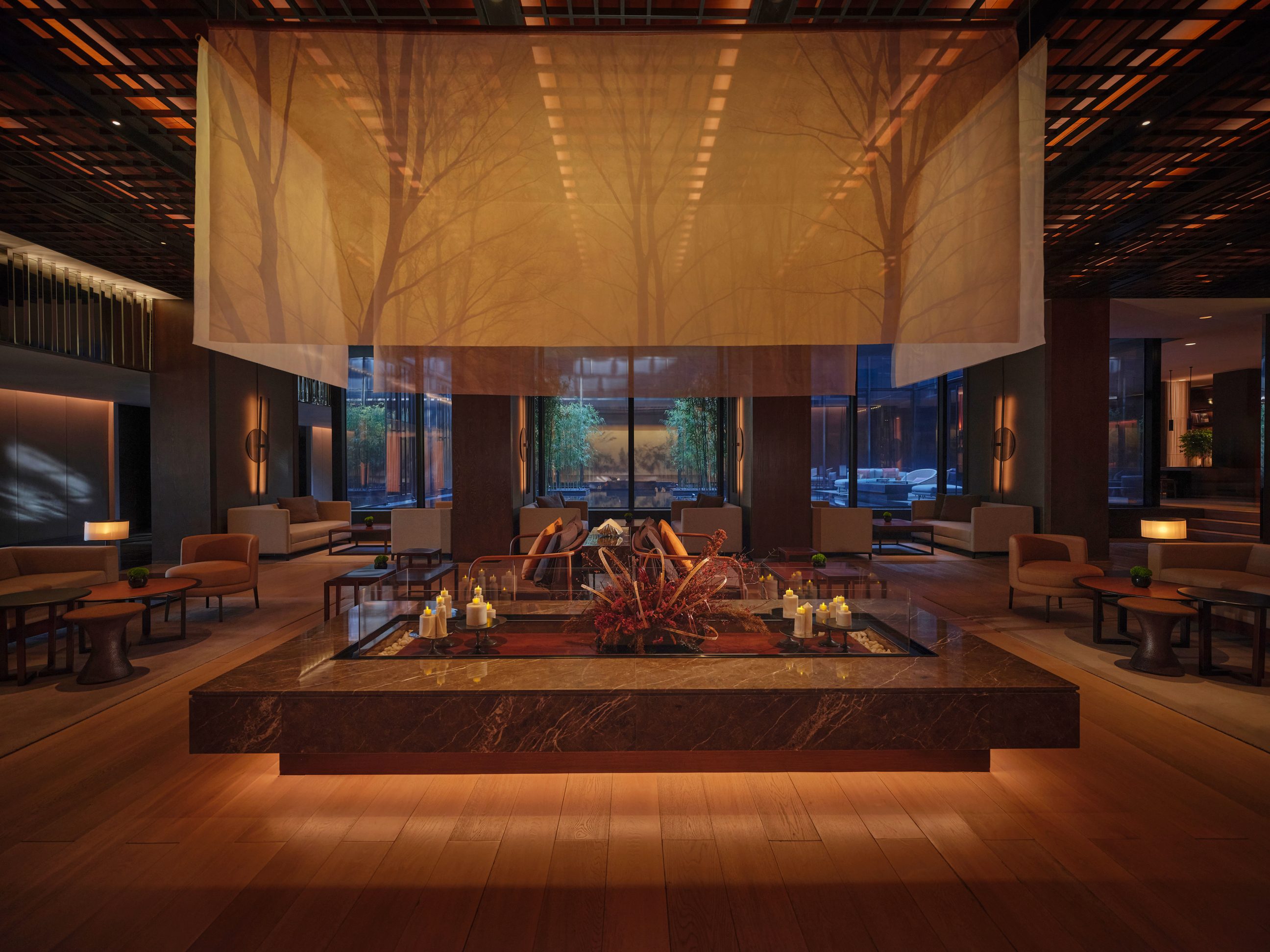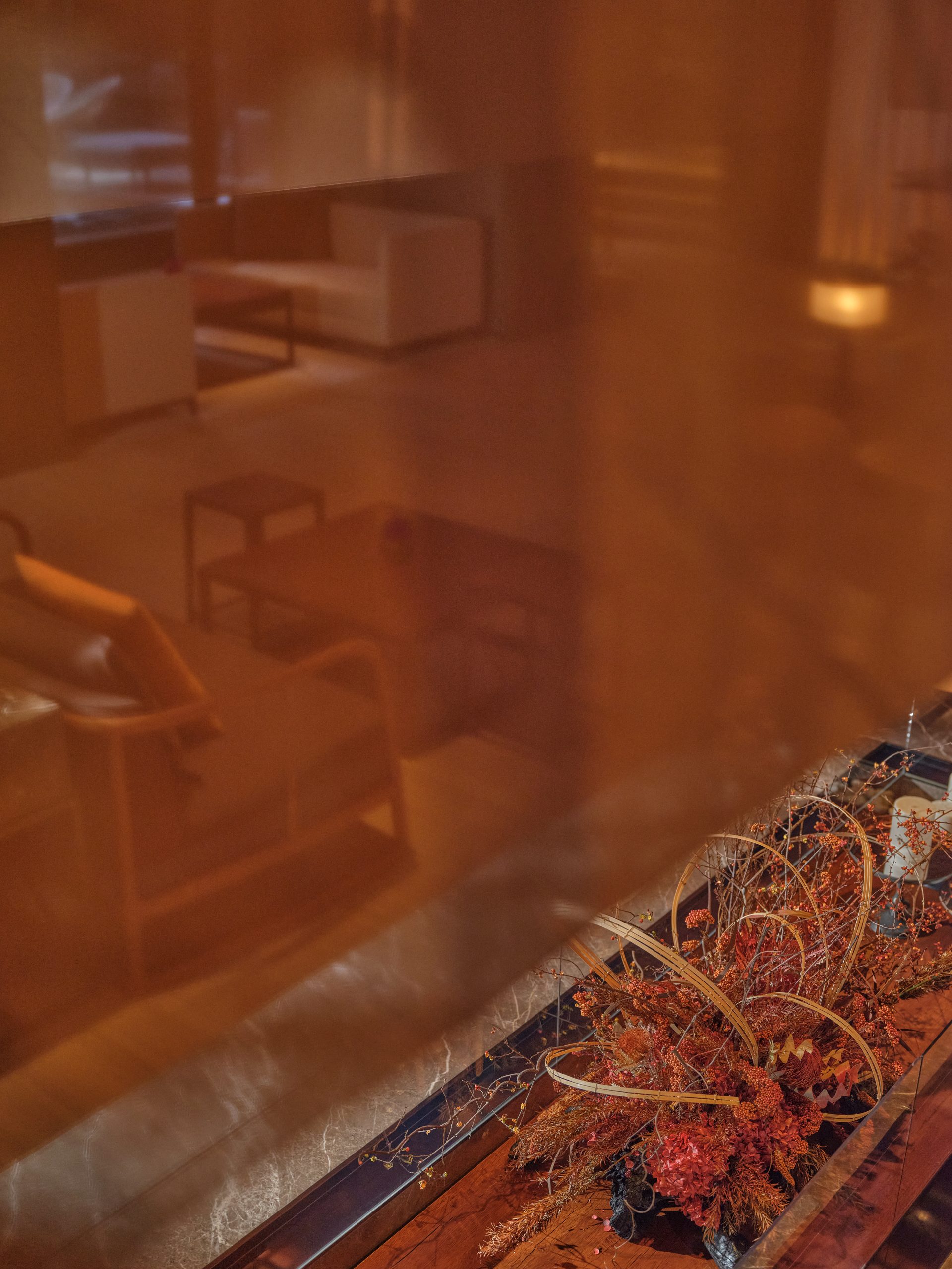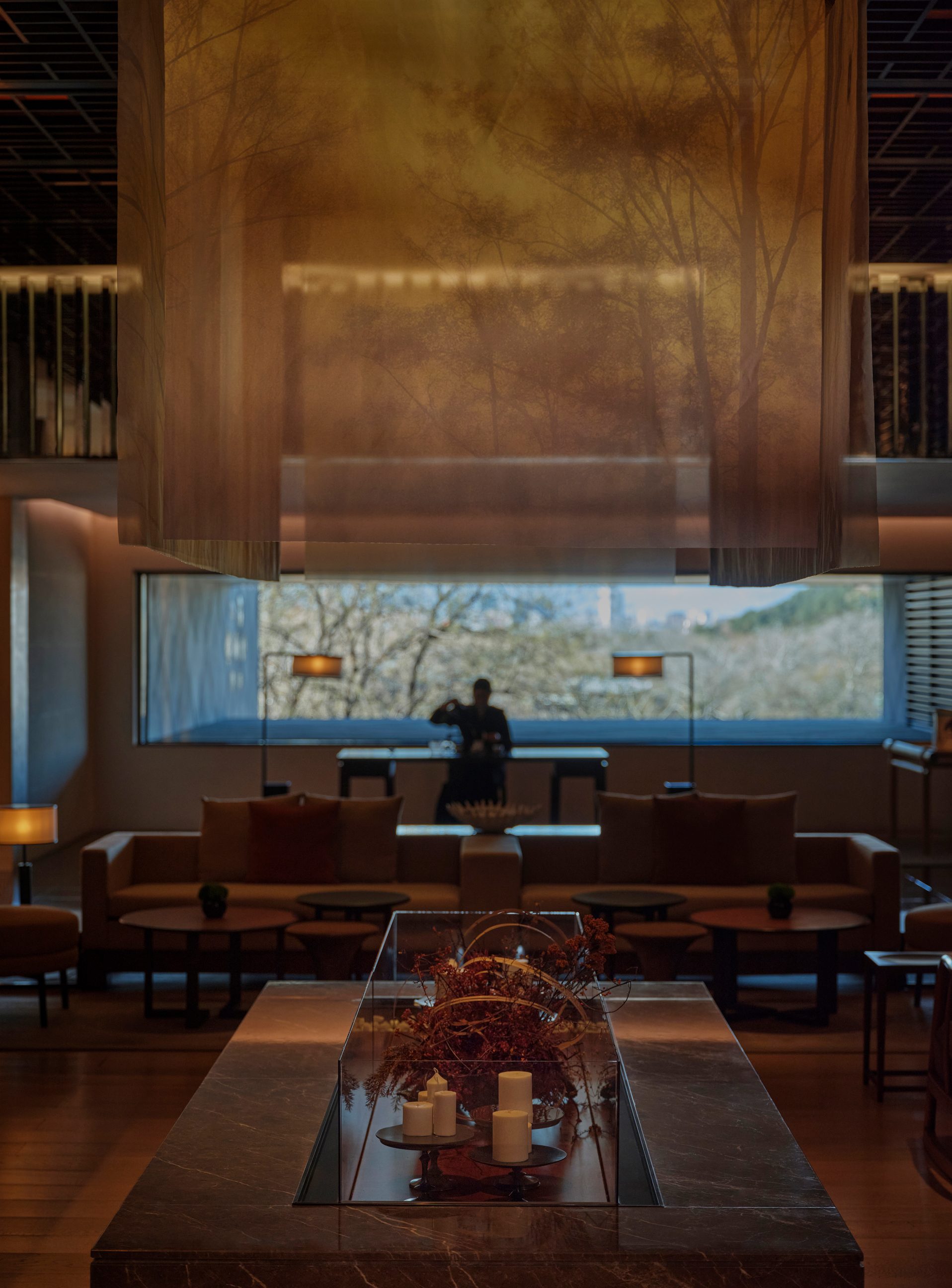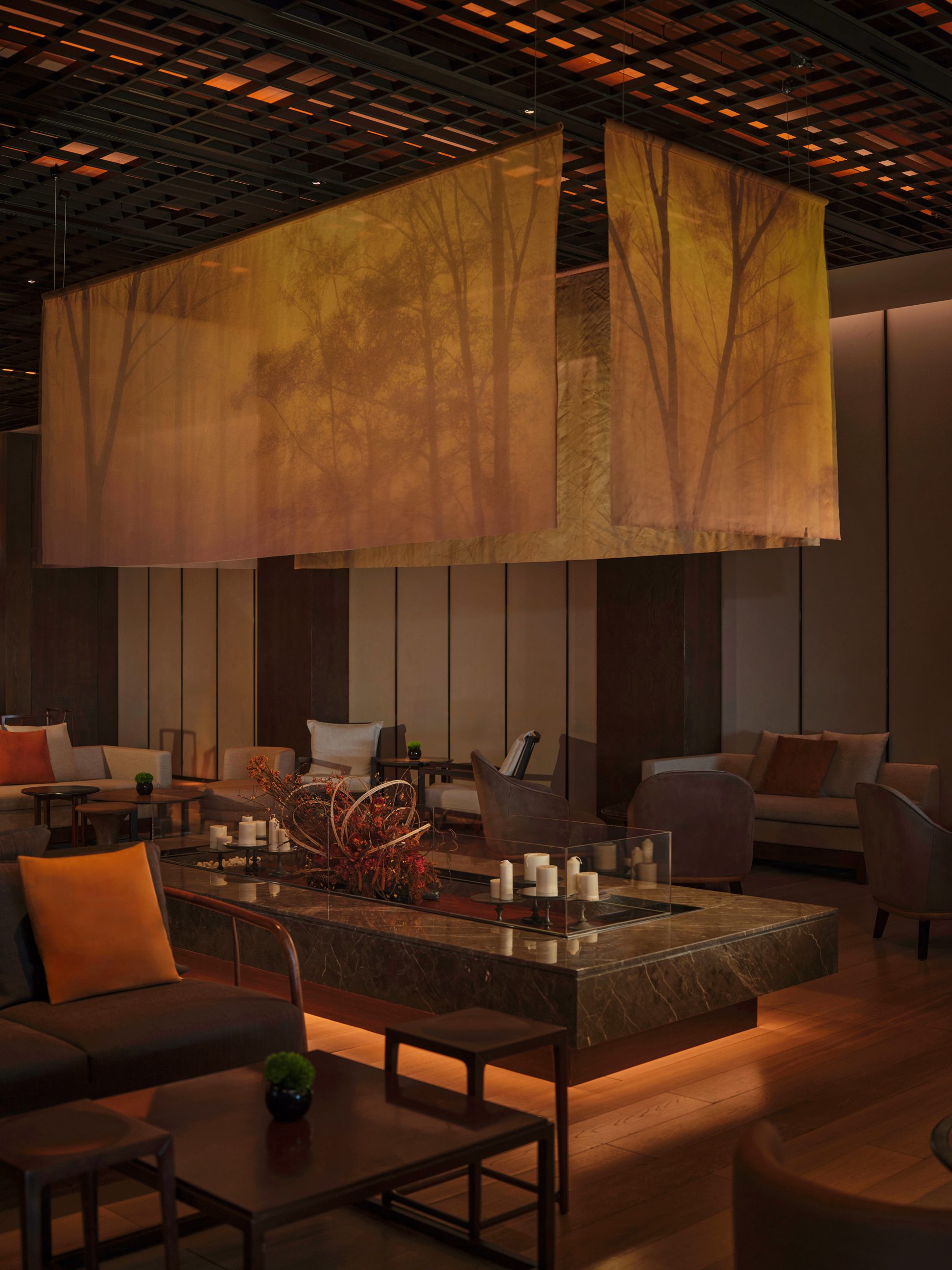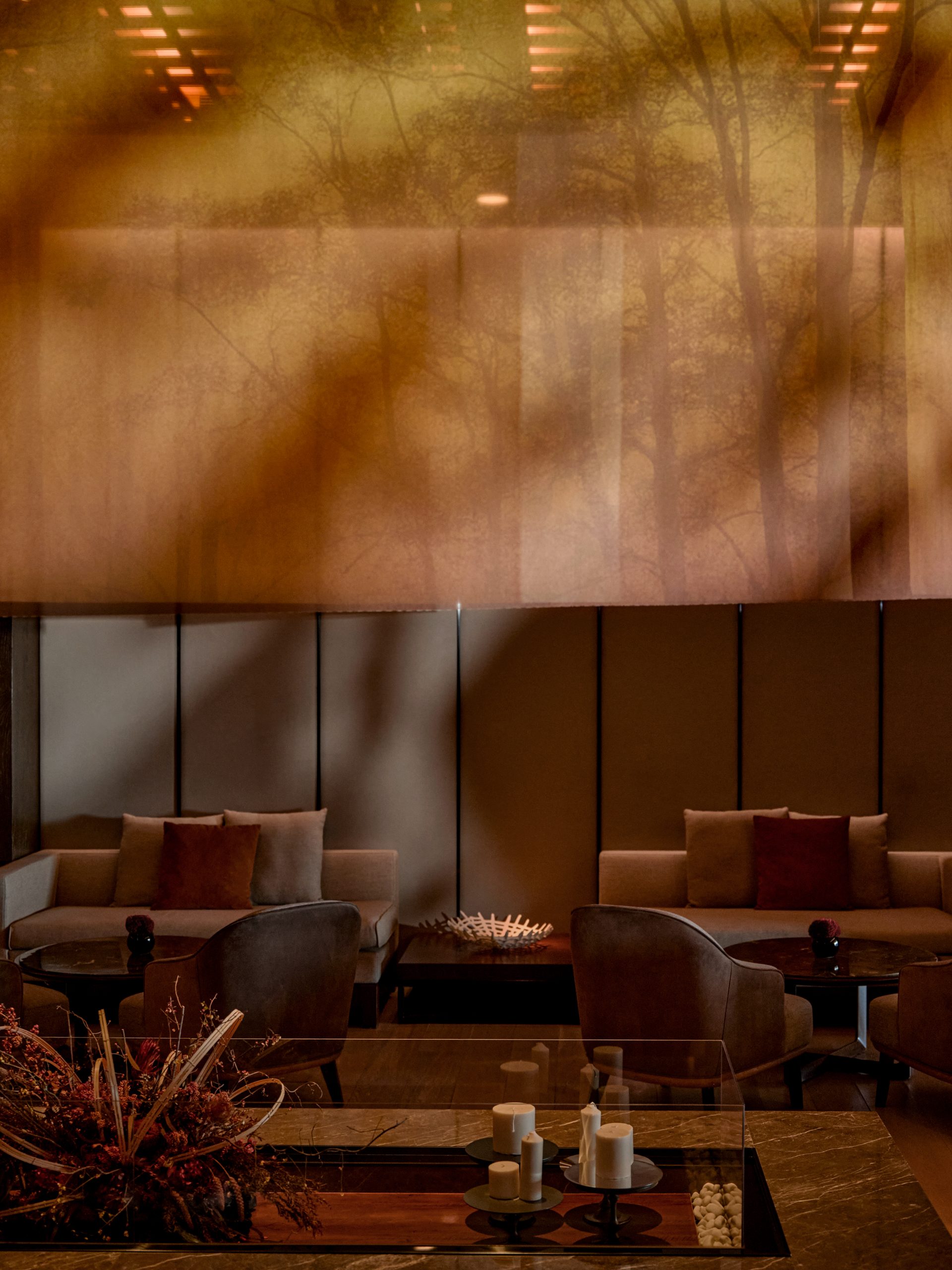 装置借由森林的结构、雾的轻盈以及冬季光线的金色质感,唤起人们记忆中温暖而宁静的时光——仿佛日落穿透树冠、微光在空气中沉淀的瞬间。作品通过光影与特殊绒面材质的协同,使自然的能量在室内重新流动,将每一分秒的光影都纳入这场艺术梦境中,让观者在冬日节庆的氛围里,获得一种步入静谧林间的沉浸体验。以此也邀请宾客,于大堂吧及左岸 · 法餐厅感受不可被复制的定格瞬间,唤起这个季节特有的记忆,体验艺术与活共融的回响时刻。