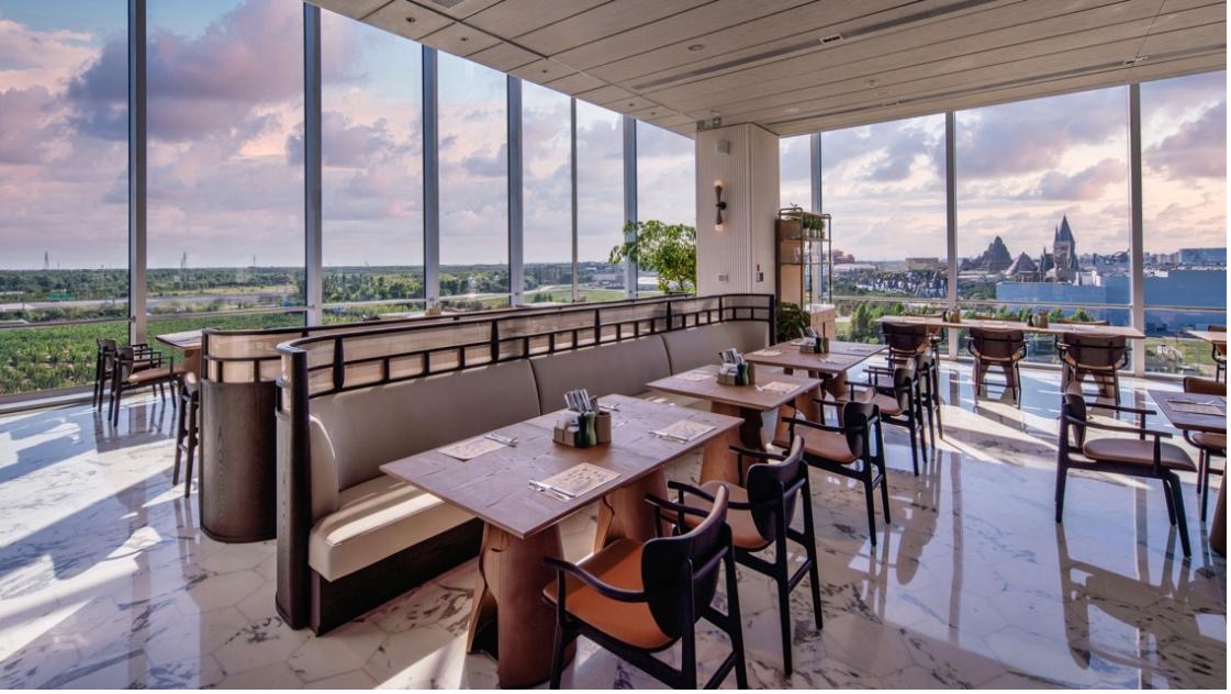 酒店建筑由国际知名设计公司Aedas 操刀,灵感源自巴比伦空中花园,通过拱形玻璃幕墙与悬挑式“水晶盒”结构,打造“垂直生态空间”,实现建筑与自然共生。室内设计由CCD团队打造,将大运河文化元素通过艺术作品融入空间肌理。核心亮点“艺术盒”与“水晶盒”双社交空间各具特色:1008平米“艺术盒”连通多个艺术多功能厅,“水晶盒”整合接待大堂、全日制餐厅、星空泳池等多重空间;300平米“诺岚花园”适配户外餐饮、婚礼等场景,310平米屋顶花园可观赏环球夜景,全面满足多元社交需求。