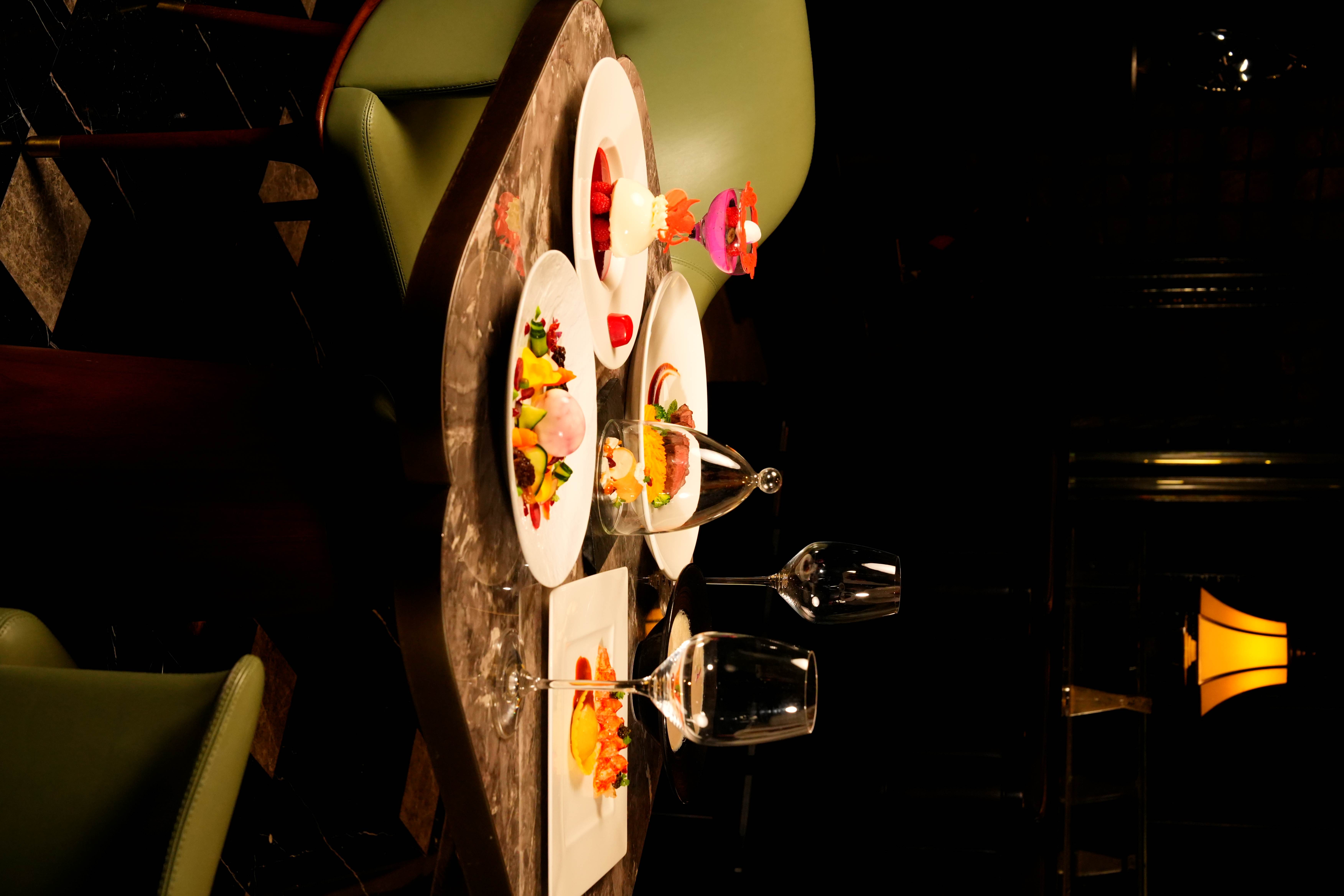 甜蜜收尾环节氛围感拉满,柠檬雪葩清爽解腻,红心火龙果酸奶慕斯冻搭配燕麦棒,酸甜交织;镜面椰子慕斯蛋糕颜值出众,覆盆子的酸甜、意式蛋白酥的轻盈,搭配草莓汁巧克力心片,将浪漫推向高潮。两杯菲斯奈特气泡酒的加持,更添微醺惬意。