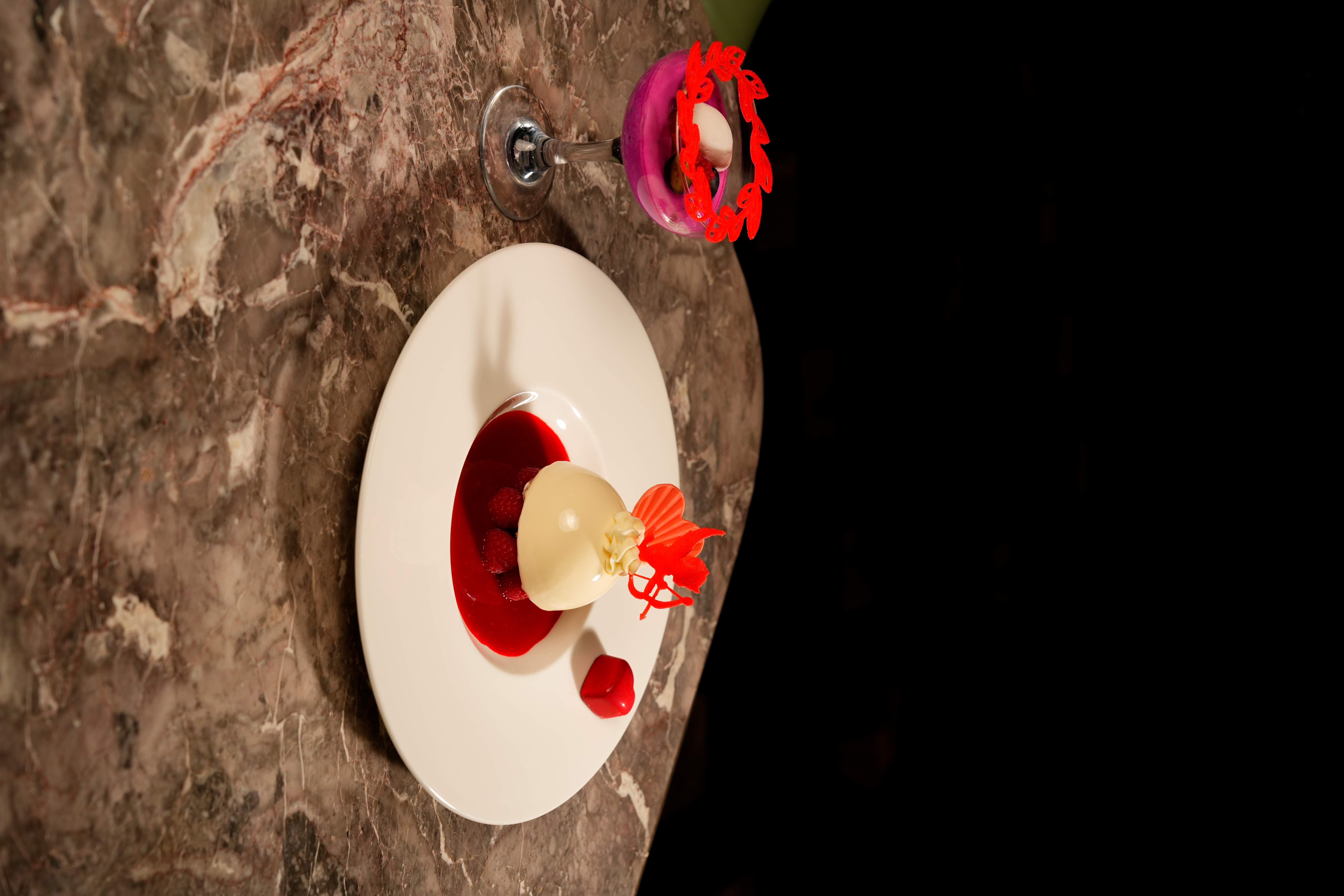 镜面椰子慕斯蛋糕配覆盆子,意式蛋白酥,巧克力心片伴草莓汁(右)