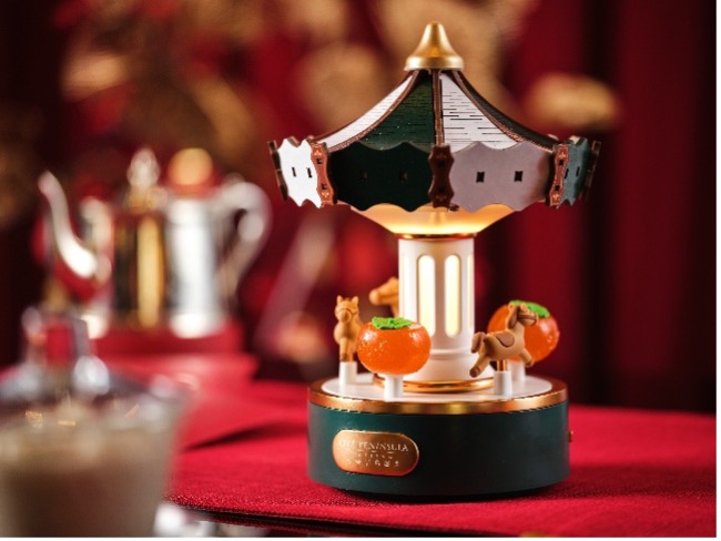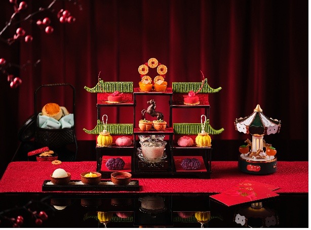 精致甜点中,位于中心位置的金币环由五枚巧克力金币组成圆环寓意新年伊始五福临门、甜蜜美满。花椒黑巧克力柑橘蛋糕,浓郁醇厚的黑巧克力与清新酸甜的柑橘相辅相成,花椒以惊喜之姿增添独特的麻味和香气,融合中西方双重风味,为经典搭配带来新意;焦糖海盐花生灯笼,咸甜交融的焦糖海盐巧思加入香醇的花生,风味层层叠加,灯笼造型赋予喜庆团圆节庆氛围;大米醪糟布丁,软糯清甜的大米搭配醪糟独特酒香和酸甜发酵的香气,盛置在晶莹剔透的茶盅里,邀请宾客一品甜甜蜜蜜。香橙软糯旋转木马,厨师团队选用冬季时令水果柑橘,塑以象征事事如意柿子造型,与旋转木马一起传递顺风顺水的吉祥寓意。