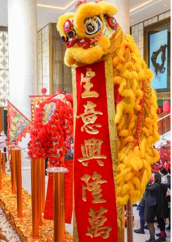酒店董事总经理将携酒店管理团队以醒狮点睛仪式赋予其生命和灵气的祥龙瑞狮,伴随着铿锵有力、有节奏的鼓点正式开启由六狮一龙带来的贺岁表演,外形威武的瑞狮在高低错落的梅花桩阵中,辗转跳跃,气势磅礴的祥龙在中游走穿梭,起伏翻腾,一同带来祥和欢乐气氛。随后祥狮在酒店中式宝塔屋顶牌楼下采青接财,宾客们与祥狮一同回到酒店大堂,吐福纳禧,召回吉祥好兆头。最后,在酒店大堂白石桥台阶呈现《元宝青阵》表演,分享寓意财运兴旺的“金币”,同纳鸿运,共贺丙午马年的到来。