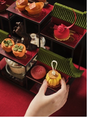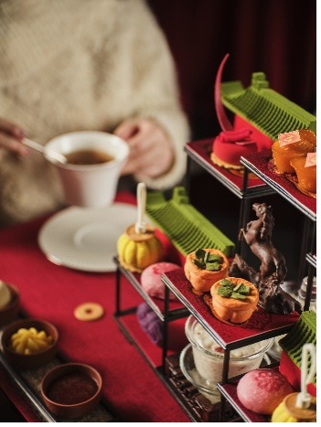 酒店厨师团队巧思将传统英式下午茶的咸点部分变更为极具中式特色的酥点与糕点精巧呈现。包含,柿子酥,外皮融合芝士粉与面粉,香酥可口,内里包裹富平柿饼与绵密奶黄馅,柿果造型玲珑讨喜,寓意事事吉祥,如意美满;玫瑰豆蓉饼,承袭经典宫廷酥皮点心工艺,酥皮层层叠进,內馅精选云南鲜玫瑰花瓣和自制绿豆沙,入口花香弥漫,甜而不腻;蜜柚圆子元宝,以香糯南瓜搭配清香蜜柚,捏作元宝之形,咬开即涌出温润流心的黑芝麻馅,象征财源广进、圆满吉利;青柠薯泥如意糕,选用新鲜紫薯打成细腻薯泥,融入清新的青柠与柔滑的奶酪,塑成如意之状,每一口皆传递着吉祥顺意的美好心意。以及此次限定期间全新推出的半岛山楂司康和黑芝麻司康配凝脂奶油,柠檬酱及草莓酱更是不容错过。