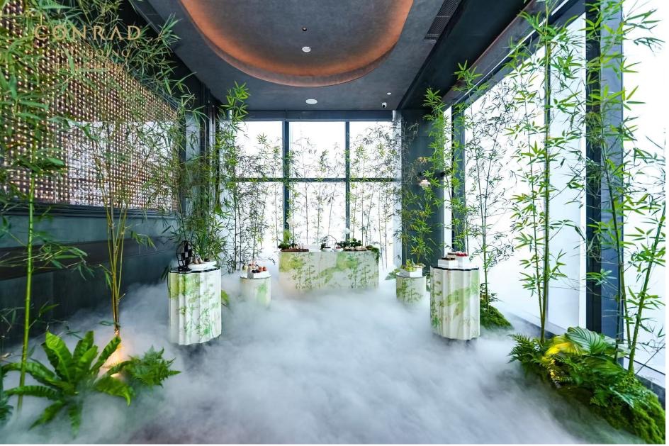 重庆康莱德酒店甜品总厨刘泉林先生的分享中,富有创意的甜品品鉴将活动逐步推向高潮。随着主持人引导宾客步入神秘空间“3652”,一幅烟雾轻笼的高空竹林造景徐徐展开,令在场宾客赞叹不已——竹影摇曳、茶席清雅,古筝声起,三者相映成趣;置身缭绕云气之间,仿佛悠然漫入山野秘境。