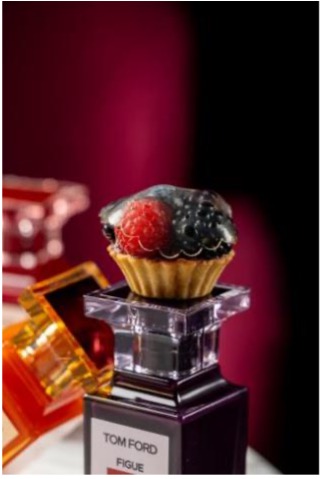 作为呼应TOM FORD「蜜欲之果」香水的核心甜品,以莓果园为意象,在杏仁塔壳上铺陈黑莓、树莓与蓝莓,覆以晶莹香草冻,搭配自制无花果酱,口感层次丰富,带来诱人的无花果香韵。