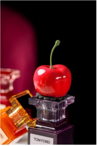 灵感来源于TOM FORD「电光樱桃」香水,明亮的红色樱桃造型精致如艺术品。酒渍樱桃酱与醇厚黑巧克力慕斯交织,深邃中透出微醺果香,诠释香氛的性感与浓郁。