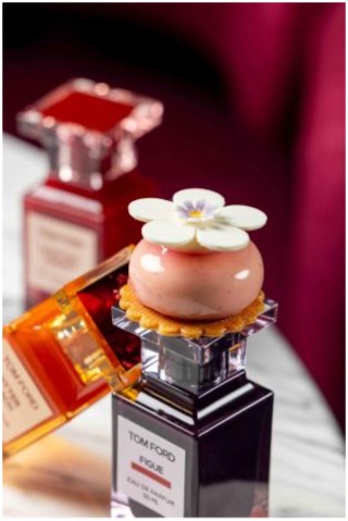 本次下午茶灵感源自 TOM FORD 最新推出的无花果香水「FIGUE·蜜欲之果」,酒店甜品大师团队从中汲取创作灵感,将无花果的气息层次,转化为可被舌尖感知的精致风味。「蜜欲之果」主题下午茶包含五款甜点、四款咸点、现烤无花果司康以及两杯田园酿造葡萄自流汁,其中由TOM FORD香水灵感打造的三款甜点尤为引人注目: