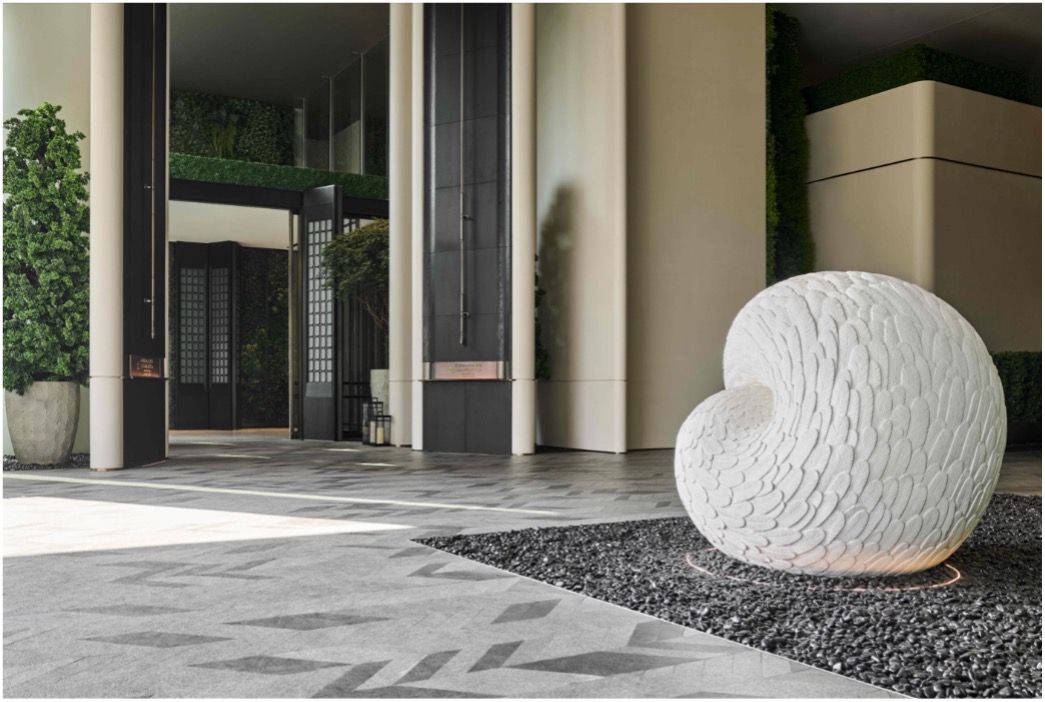 酒店室内设计由知名事务所CCD操刀,巧妙以“百鸟归巢”为核心主题贯穿空间。这一理念深刻呼应深圳作为梦想之城的特质——吸引无数追梦者如百鸟翱翔,并在此创造属于自己的故事。酒店大门外引人注目的白色艺术品,是艺术家Kate MccGwire以无数羽毛创作的“卵鸟”雕塑。它隐喻鲲鹏之变,象征破壳而出的飞鸟翱翔天际,既是对“百鸟归巢”所代表的深圳追梦者的美好祝愿,也正式开启了酒店的艺术鉴赏之旅。