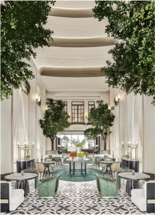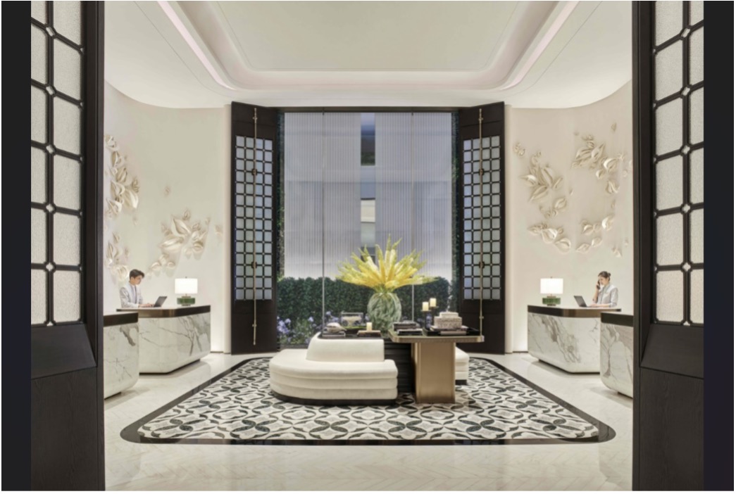 深圳南山香格里拉以绿意盎然的低调入口开场,更为隐蔽、私密和诗意。进门的黑白格纹地面呼应城市摩登风尚,柔和拱形屋顶借鉴岭南“镬耳屋”特色,营造高挑宫殿感。步入大堂,仿佛走进宛如美术馆的优雅长廊。绿植点缀其间,象征飞鸟落羽,营造自然花园氛围。艺术家刘文瑄的“飞鸟羽影”艺术品,置于镂空画框后,光影下呈现羽翼效果,走廊尽头设有花草包裹的精致花店。
