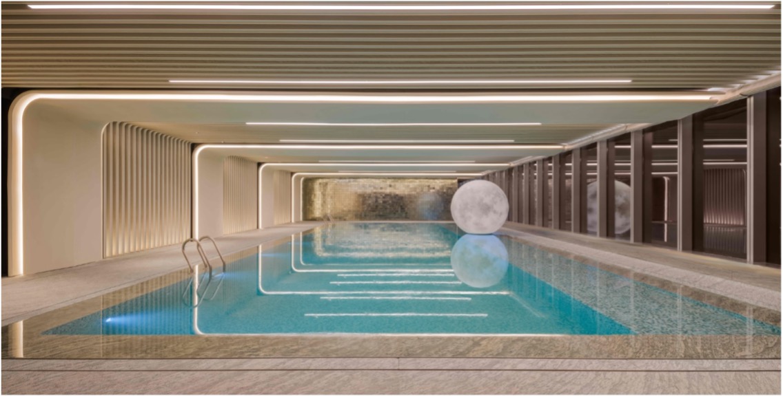 77层,是酒店的康体中心之所在,空间阔绰、设施齐全,可以享受云端之上的畅快放松。泳池的设计更是别出心裁,力邀著名艺术家黄玉龙操刀设计艺术品——“海升明月”,散发着柔和光芒的月球放置于泳池中间的水面之上。每至夜幕降临,深邃的夜空、皎洁的月光和静谧的池水构建出浪漫的意境。