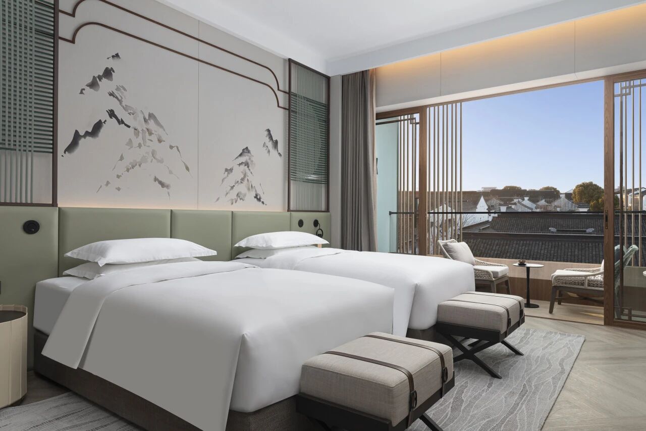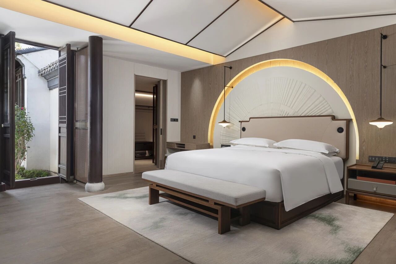 丙午新春下榻于此,便是一场穿越古今的团圆。178间客房以庭院式布局铺展,木石居推窗见园,水竹居卧听风雨,碧山仙隐藏身园林深处,每一间皆以华太师诗词为灵感,将树叶沙沙、流水潺潺融入空间肌理。客人可乘摇橹船泛舟北仓河,于清溪桥下穿行而过;亦可于碧山堂品一杯鸡尾酒,让诗意与当代调酒技艺在杯中相逢。