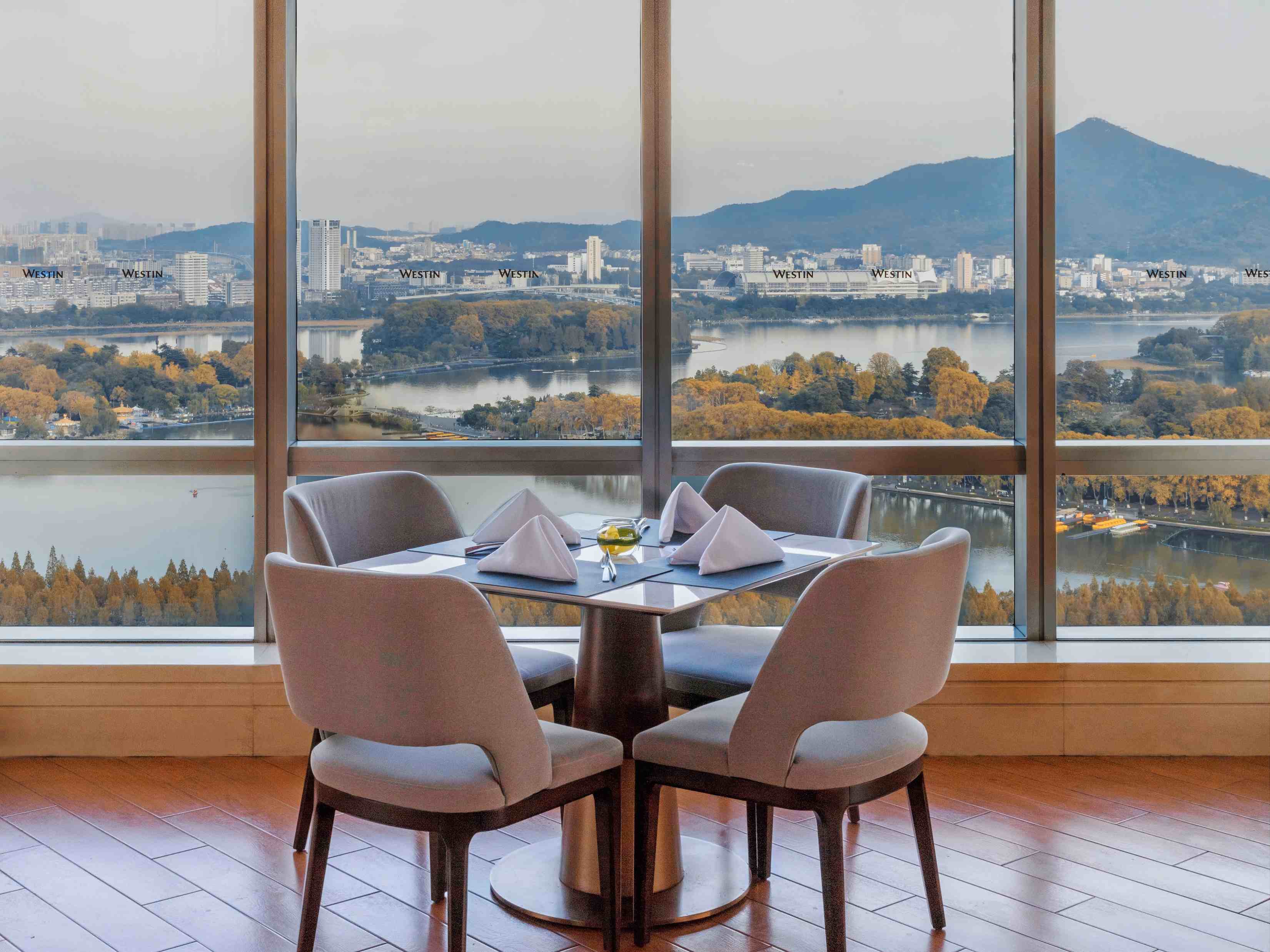 杭州西溪喜来登度假大酒店外观自然环境、从北京乐多港万豪酒店短车程可达居庸关花海、南京金茂威斯汀酒店知味餐厅玄武湖景