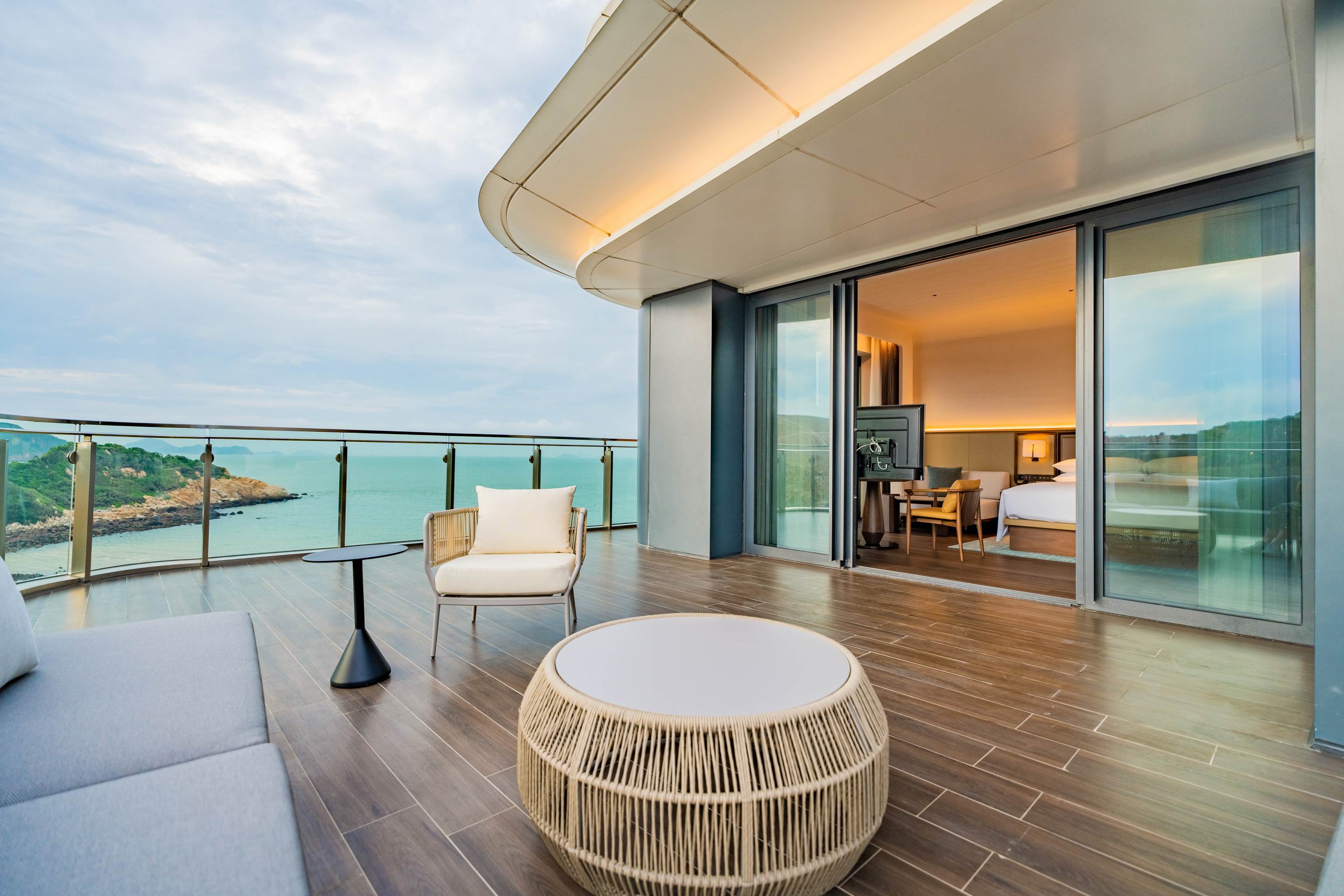 小径湾艾美酒店周边的西线乌头山滨海绿道、珠海东澳岛万豪度假酒店海景露台客房、厦门万豪酒店及会议中心面朝大海