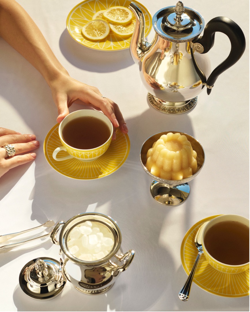 镀银餐桌珍品,从餐巾环、刀架、席位卡夹到杯垫,为马勒梅松银器系列画龙点睛。瓷器的深邃明黄与银器的璀璨光泽交相辉映,营造出明亮动人的装饰对话。