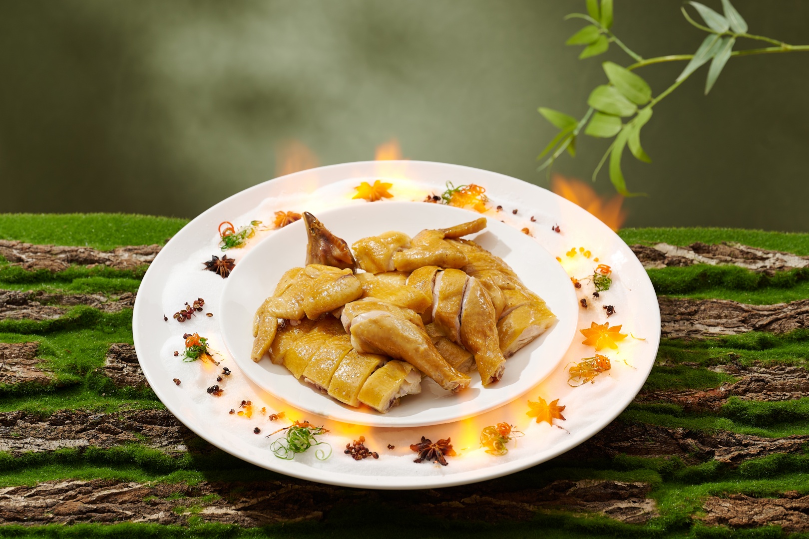 火焰东江盐焗鸡选用粤北散养果园鸡,以传统客家盐焗为基底,辅以火焰创意呈现,外香内嫩,烟火气中藏着一座山的馈赠;蜜味茶皇九节虾则采明前春茶入馔,一芽一叶锁住春意,虾鲜与茶韵交织,清润与甘香层层递进。