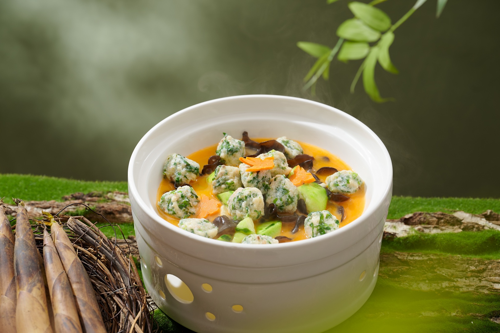 收尾的手工艾草青团,取三月田间的艾草捣汁和粉,裹入绵密豆沙,蒸腾出田野独有的清香,为整席春宴画上圆满句点。