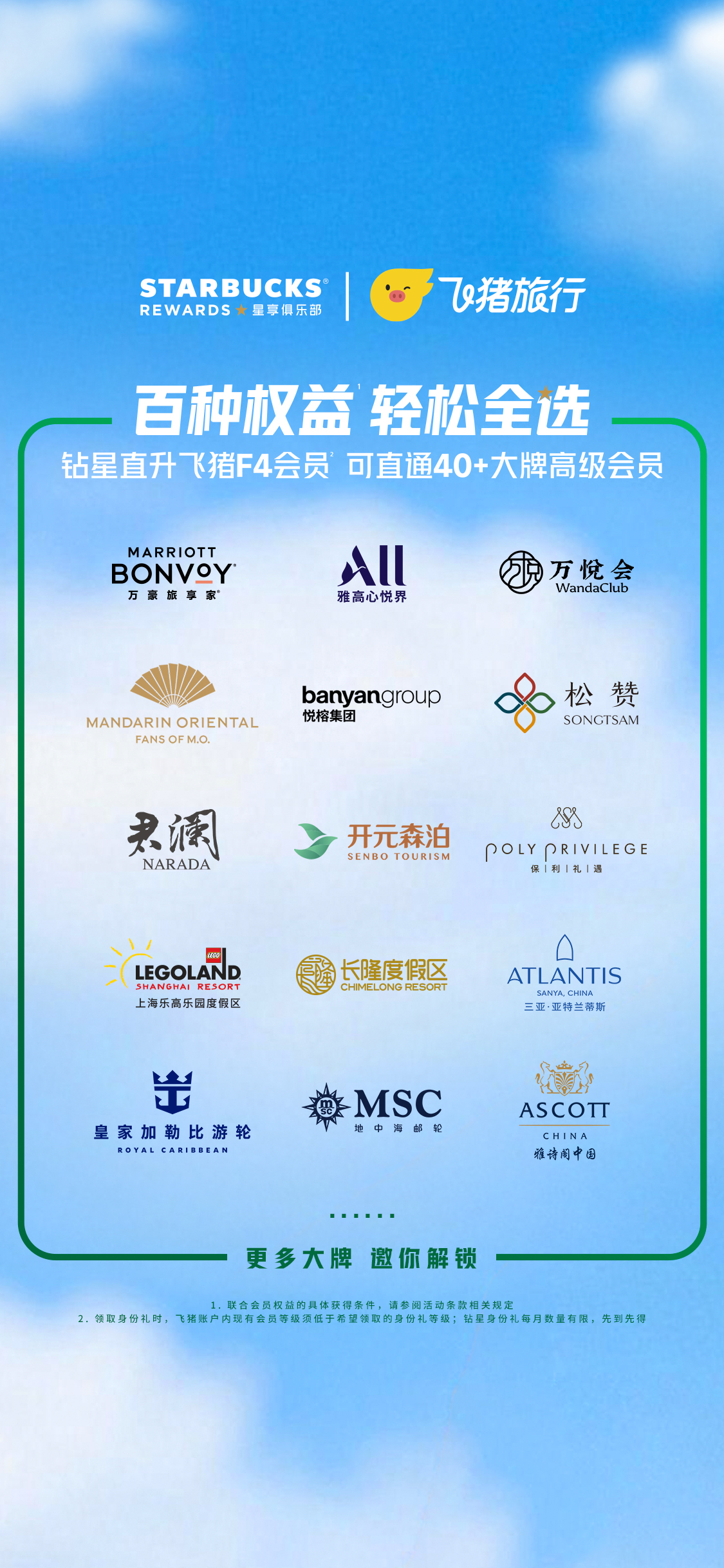 其中最核心的突破在于:星巴克钻星会员可直升飞猪F4会员,直通“住、行、游、玩”等场景的40+品牌高级会员,真正实现“百种权益,轻松全选”。