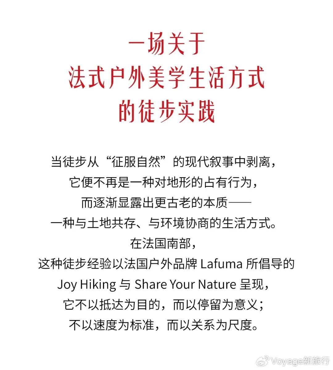 而这,正是Lafuma Origin所希望传递的:徒步可以脱离单一的运动属性,成为一种可迁移、可在地化的生活美学。从2025年的“法国之路”到2026年的“乐走南法”,再到更早的中国云南徒步,这一理念已在不同文化语境中被反复验证。