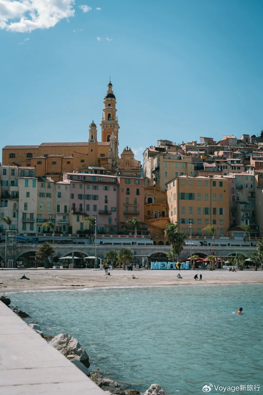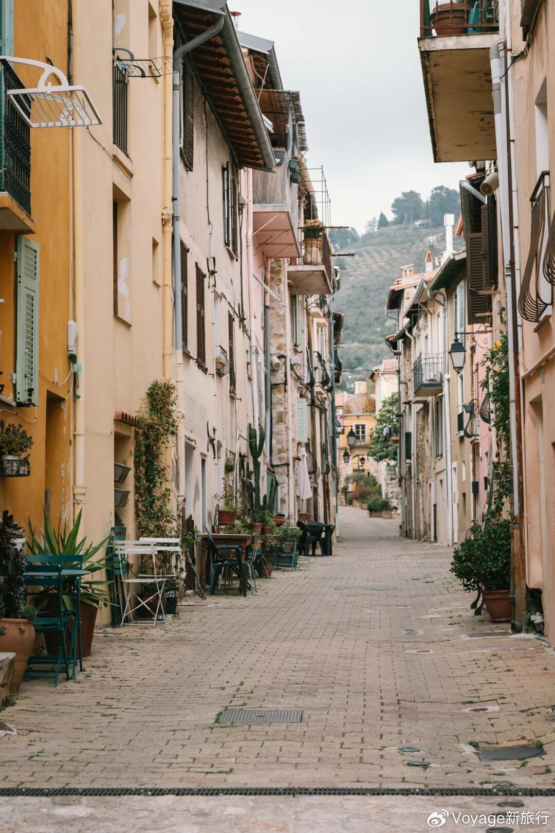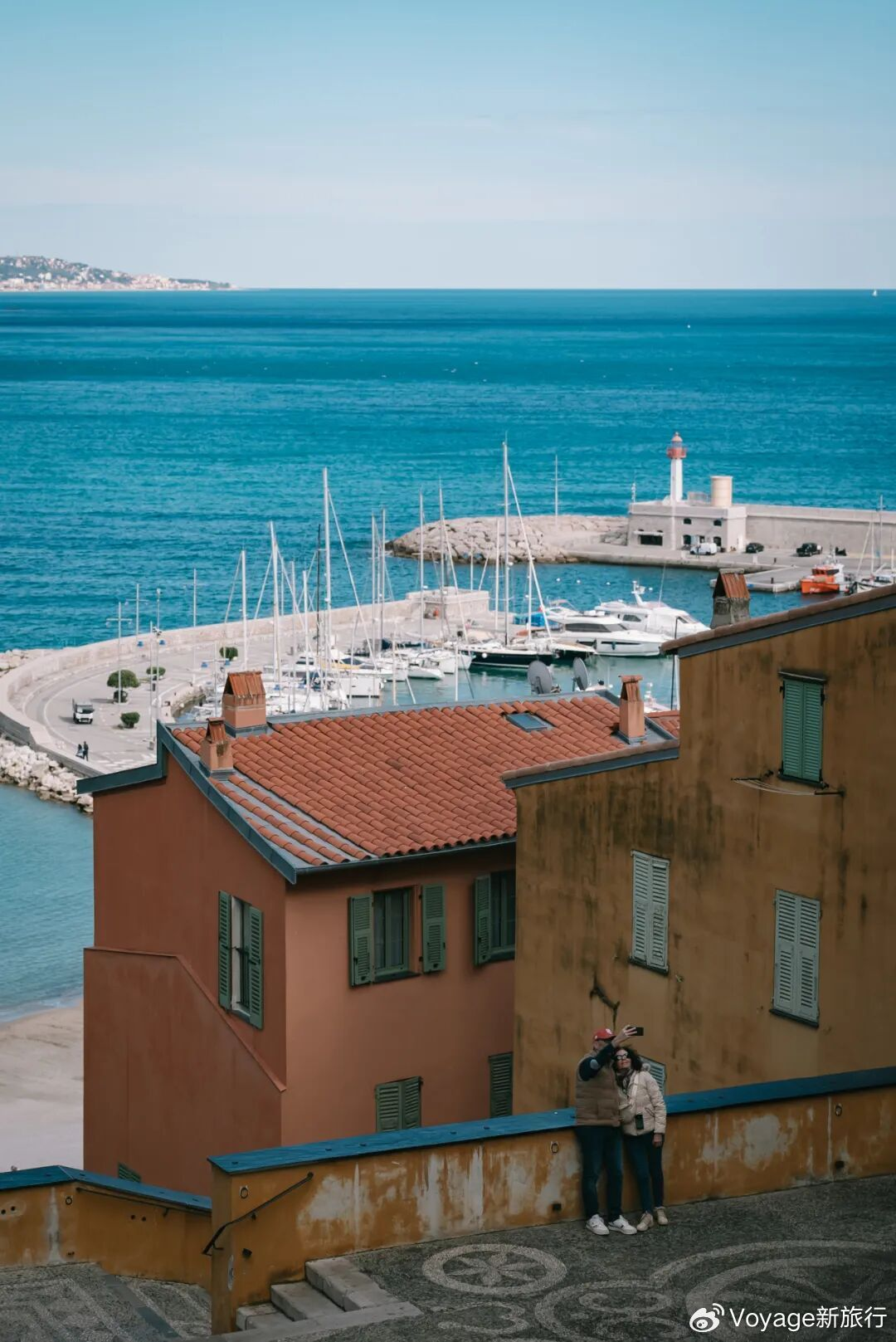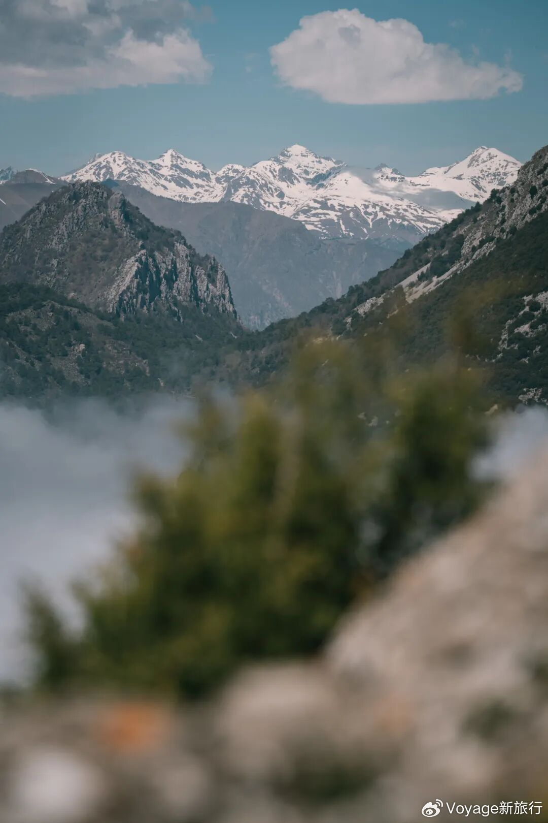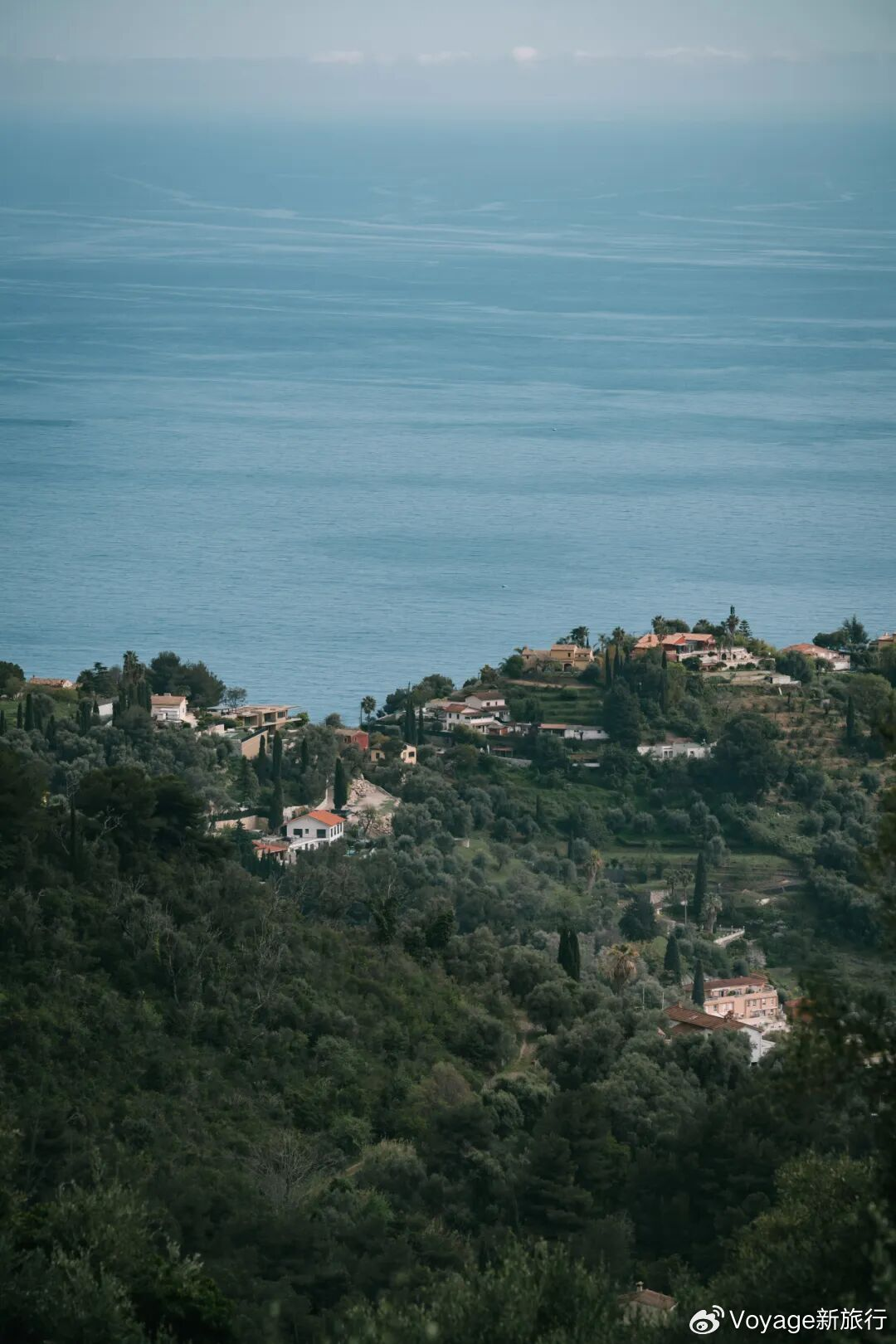 一侧是阿尔卑斯山延展的垂直褶皱,层层叠叠,带着沉静的重量;另一侧是地中海的水平铺展,海面像被拉开的光,辽阔而安静。两种完全不同的空间语言在这里相遇,使人同时处在上升与展开之间。