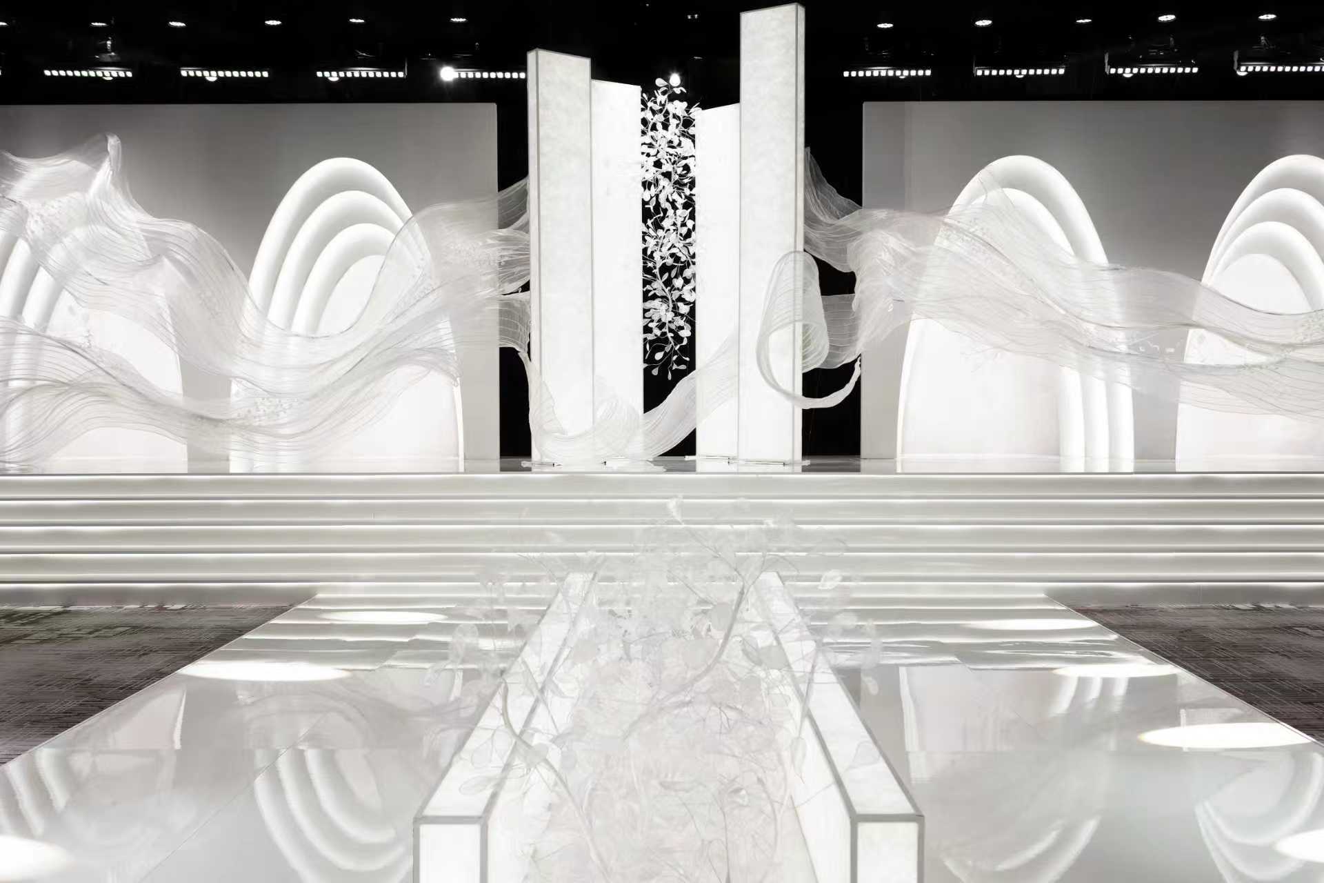 伴随乐章曼妙递进,模特身着定制婚纱款款步入舞台,一场由光影、材质与空间语境共同构成的婚礼美学演绎,仿佛由空灵梦境步入现实之中。莹白光幕与婚纱轮廓交织起伏,蕾丝刺绣的精致纹理、极简廓形的现代线条与层叠裙摆所延展出的轻盈张力,动静之间彰显非凡格调与隽永意境。