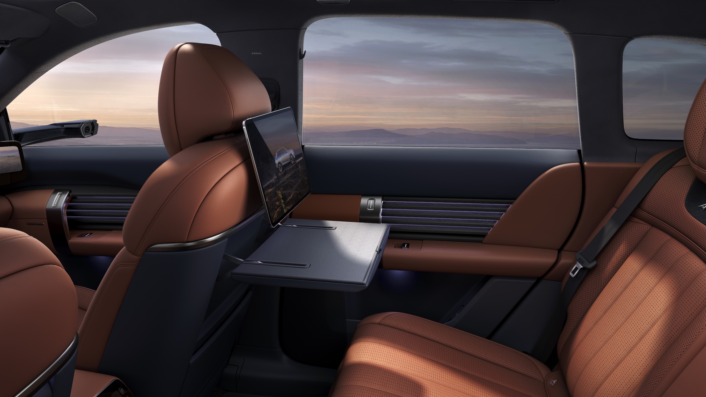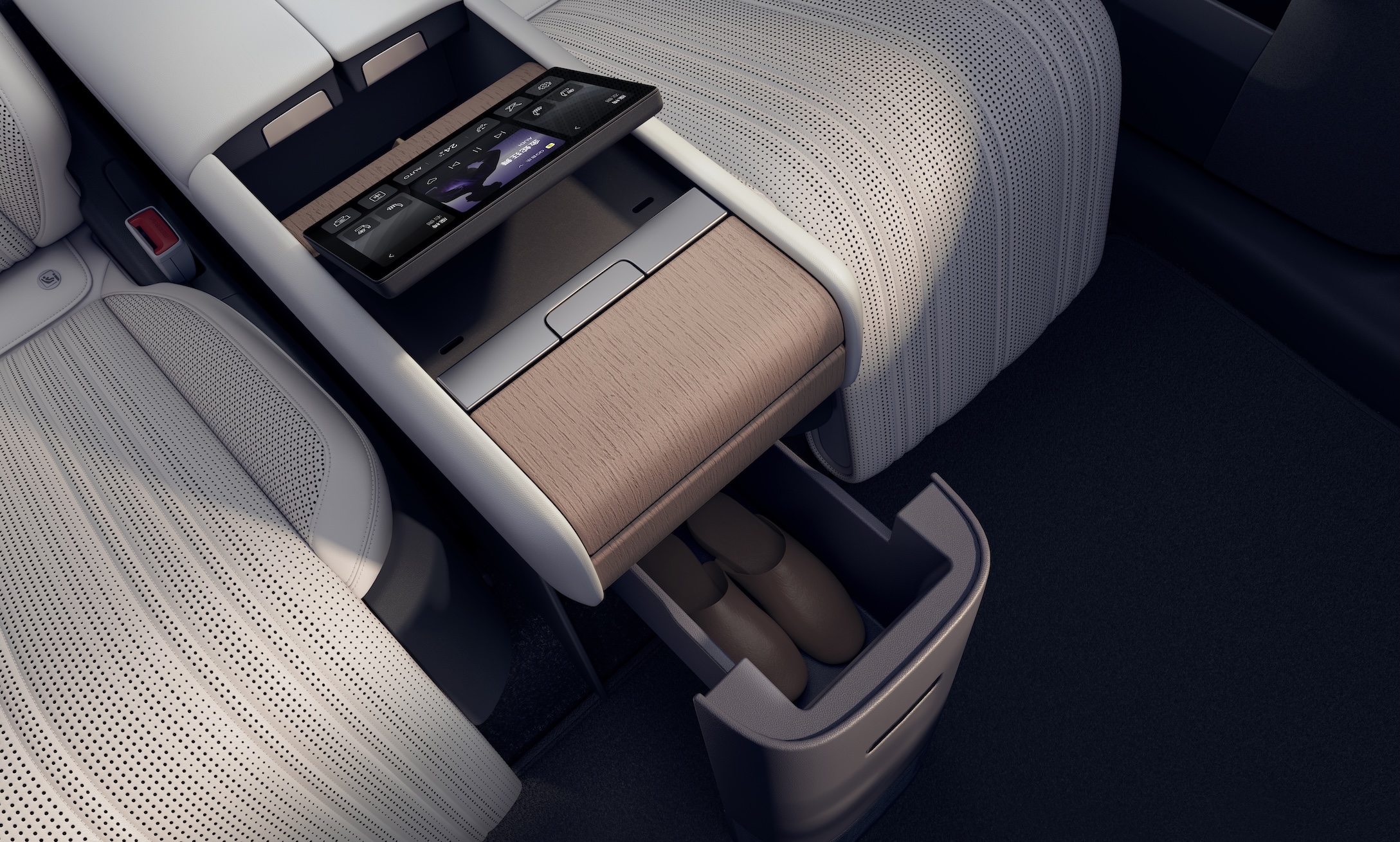 四座行政版配备两个独立后排座椅,带来进阶的零重力体验:每个座椅可展开为深度放松的休憩姿态,最大靠背倾斜角度达120度,配合23气袋气动调节系统和背靠+坐垫16点按摩功能。4向随动头枕高度和角度均可调,适配观影和休憩场景;集成电动腿托可伸展至400mm,可舒适容纳身高超过1米8的乘客。