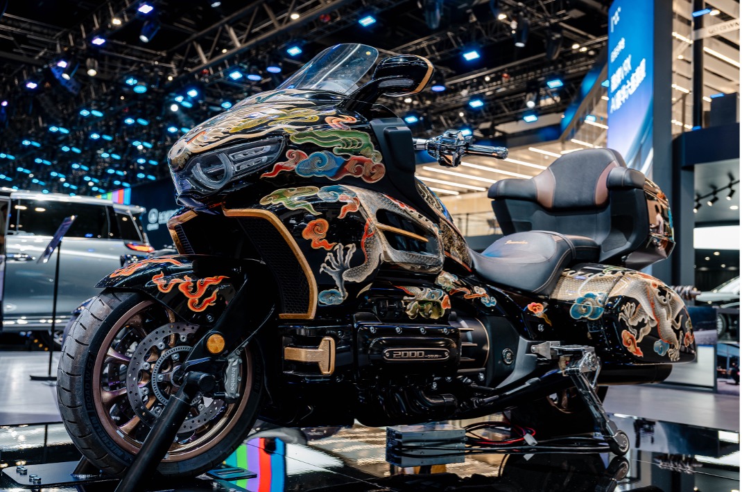 “紫禁”大漆非遗作品,甄选七年以上树龄漆树所产天然大漆,遵循“百里千刀一斤漆”的古法采制之道,历经数十道复杂工序,以漆为墨、以艺为笔,金龙腾云、火焰生辉,每一处都是对东方美学的极致致敬;“龙魂”定制作品,融合中国龙文化与骑士精神,既是中国力量的具象表达,也是传统工艺与国产高端制造联袂打造的艺术级机车。全碳改装作品,以“轻量为魂,动见锋芒”为核心,甄选碳纤维材质披上“碳纤战衣”,流畅凌厉的线条为动力猛兽量身定制优雅“西装”,静时气场拉满,动时锋芒毕露。